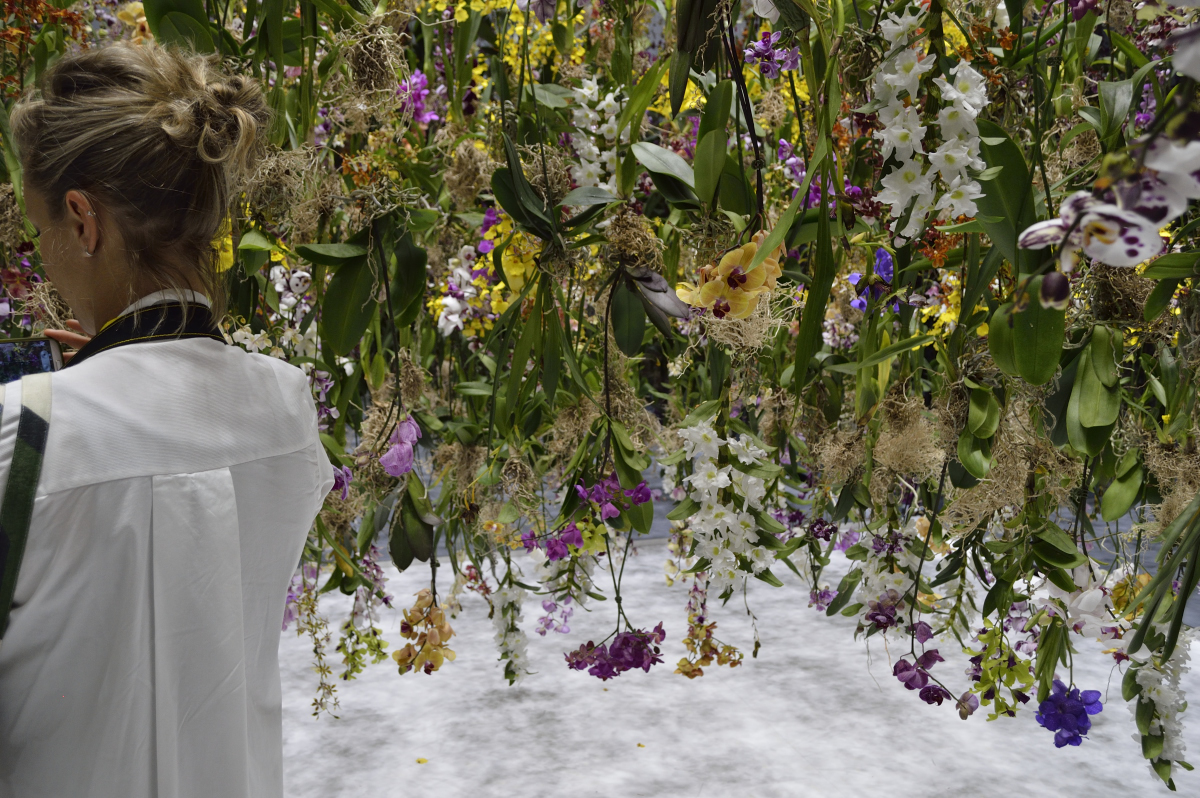 // Un giardino pieno di fiori vivi che fluttuano su e già in relazione al movimento delle persone che abitano lo spazio. Quando un visitatore si avvicina allo spazio, i fiori a lui vicino salgono verso l’alto improvvisamente, creando uno spazio emisferico con lo spettatore al centro. In questo giardino interattivo gli spettatori sono immersi tra i fiori, diventando un tutt’uno col giardino stesso.