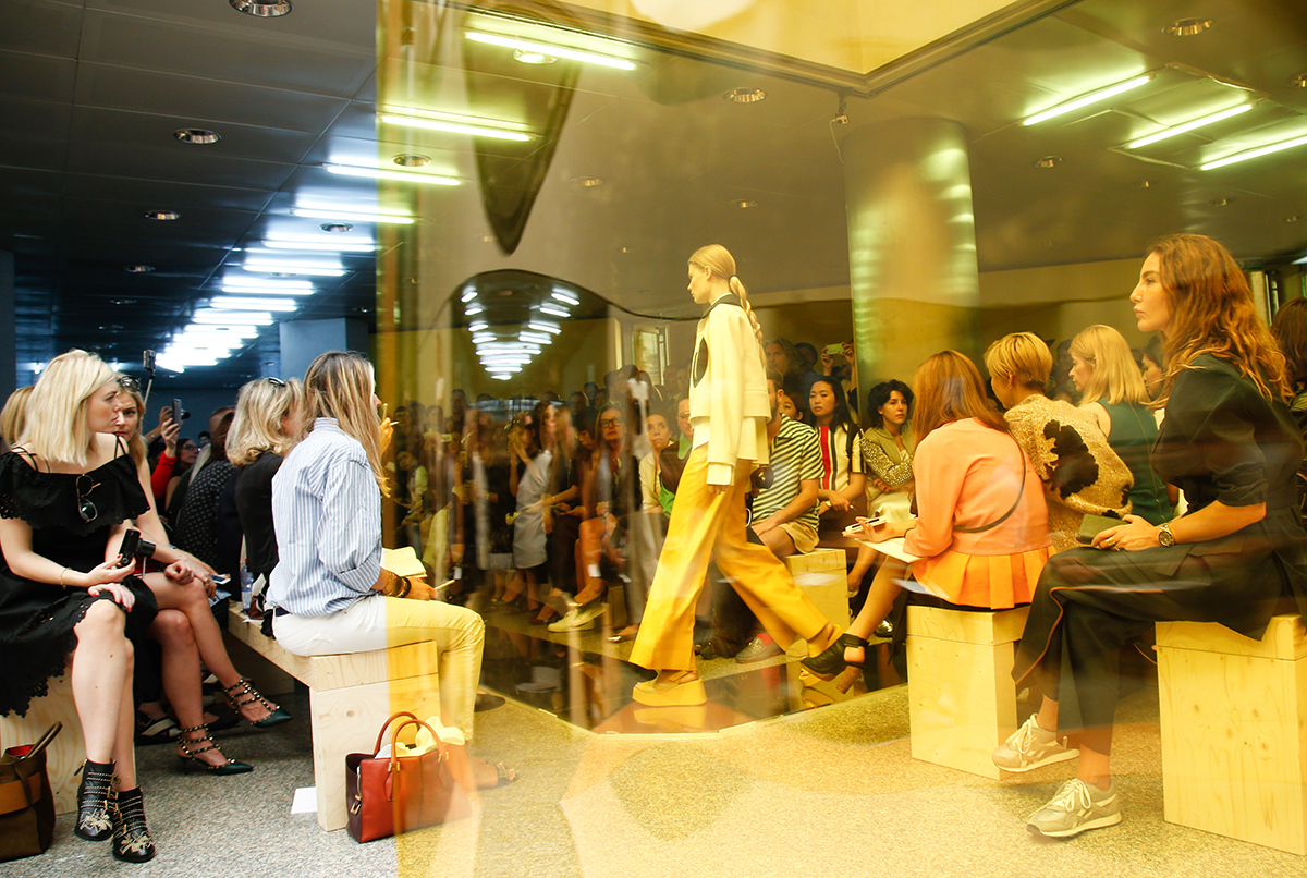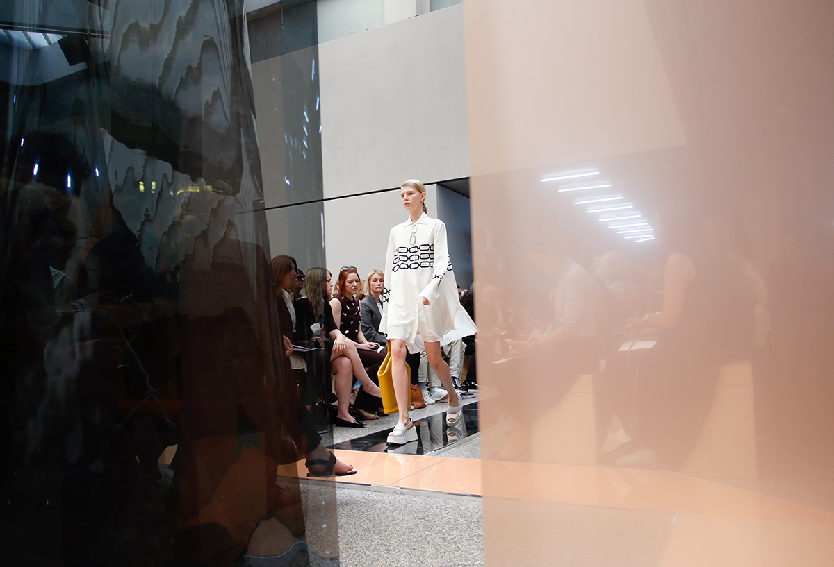 Guardando anche al lavoro dell’artista russa cubofuturista Aleksandra Aleksandrovna Ekster, le pellicole sono state posizionate in modo da delimitare la passerella, espandendo lo spazio in un circuito infinito.