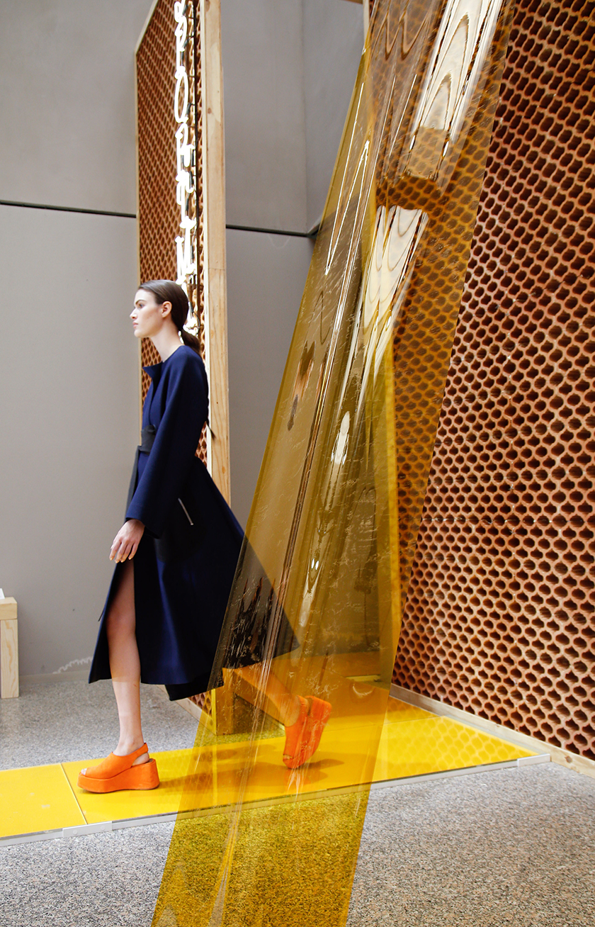 For the first time Sportmax, “the italian brand both for what concern the production and the style”, has enlisted a design studio to collaborate with in defining the set design for its Women S/S16 fashion show. The location chosen for the show was Palazzo delle Poste, an early 20th century post office building by Luigi Broggi which interiors, undergone recent intervention, featured a large dominance of stainless steel and gray nuances. To warm up a bit the severity of the building, the duo behind Formafantasma opted for two main materials: terracotta and a selection of three colored PVC films. Mainly inspired by the very sophisticated houses such as the ones designed by Pietro Lingeri on the Como lake together with Italian ‘summer houses’ built between the 60’s and 70’s, the designers wanted to achieve a ‘mediterranean’ feel (using terracotta) but with a more contemporary tone (integrating synthetic materials).