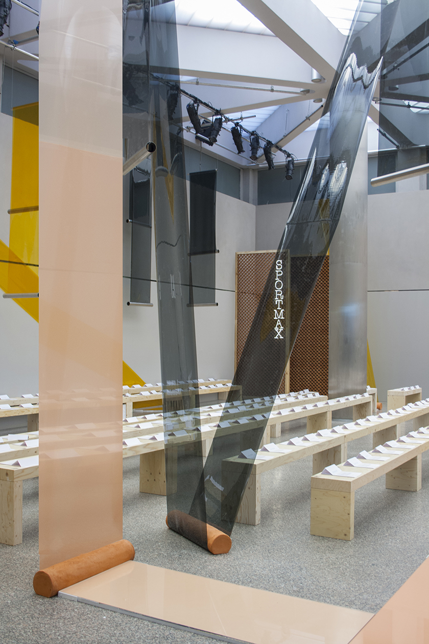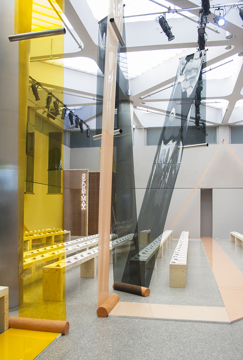 // Per la prima volta Sportmax, il brand italiano sia per quanto riguarda la produzione che per lo stile che propone, ha scelto di affidarsi ad uno studio di design per collaborare all’ideazione dell’allestimento per la sfilata donna P/E2016. Lo spazio scelto per l’evento è stato il Palazzo delle Poste, un edificio del primo ‘900 che ospitava gli uffici postali progettato da Luigi Broggi, i cui interni, sottoposti a recente rinnovamento, sono caratterizzati da una grande prevalenza di acciaio inossidabile e gradazioni di colore grigio. Per scaldare un po’ la severità dell’edificio i due designer dello studio Formafantasma hanno optato per due materiali principali: la terracotta e una selezione di tre pellicole colorate in PVC. Ispirati in gran parte da case molto sofisticate come quella di Pietro Lingeri sul Lago di Como insieme alle case estive italiane costruite negli anni 60 e 70, i due miravano ad ottenere un senso di ‘mediterraneità’, dato dalla terracotta, ma contrastato da un piglio più contemporaneo, raggiunto con l’inserimento del materiale sintetico.