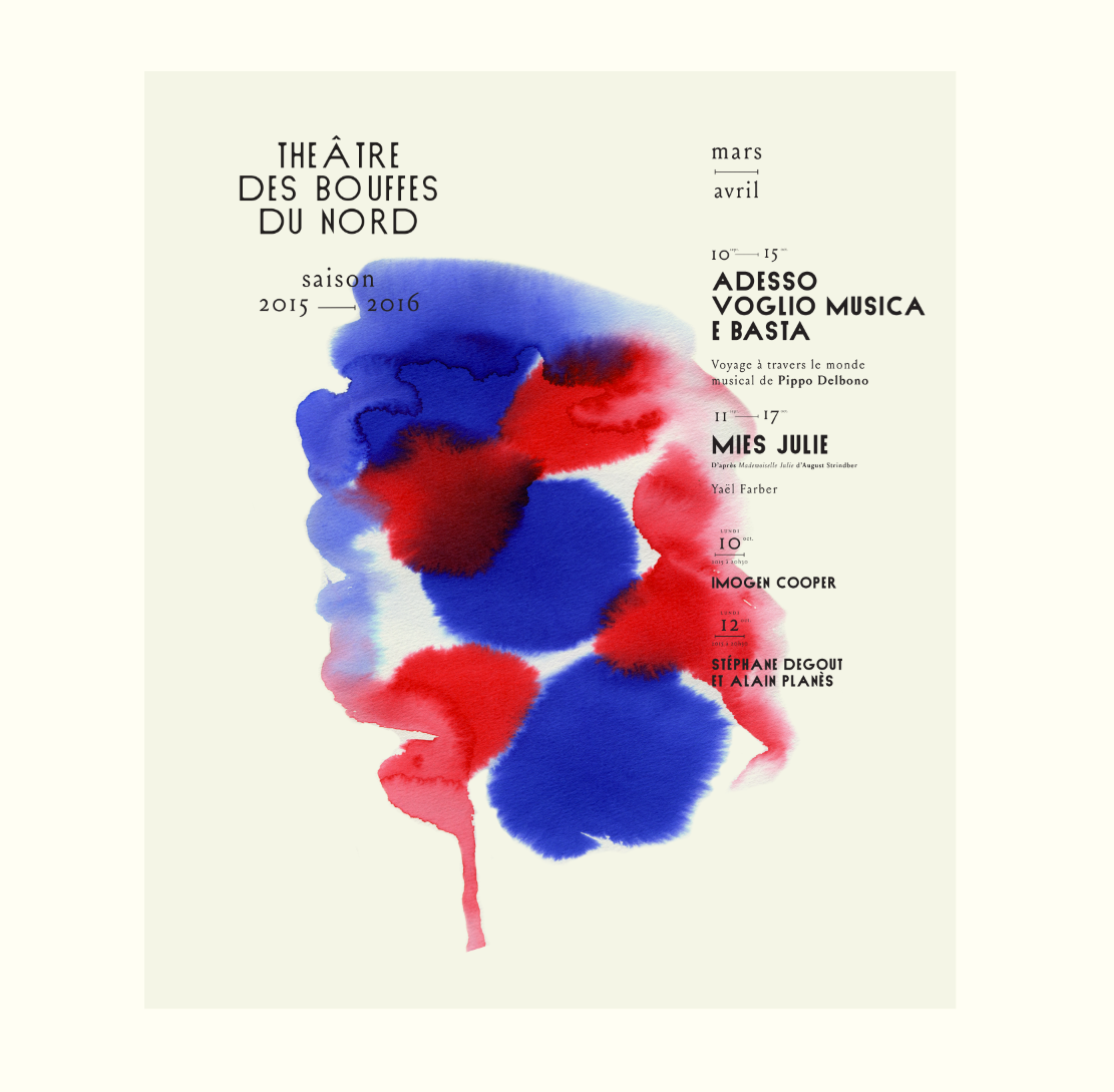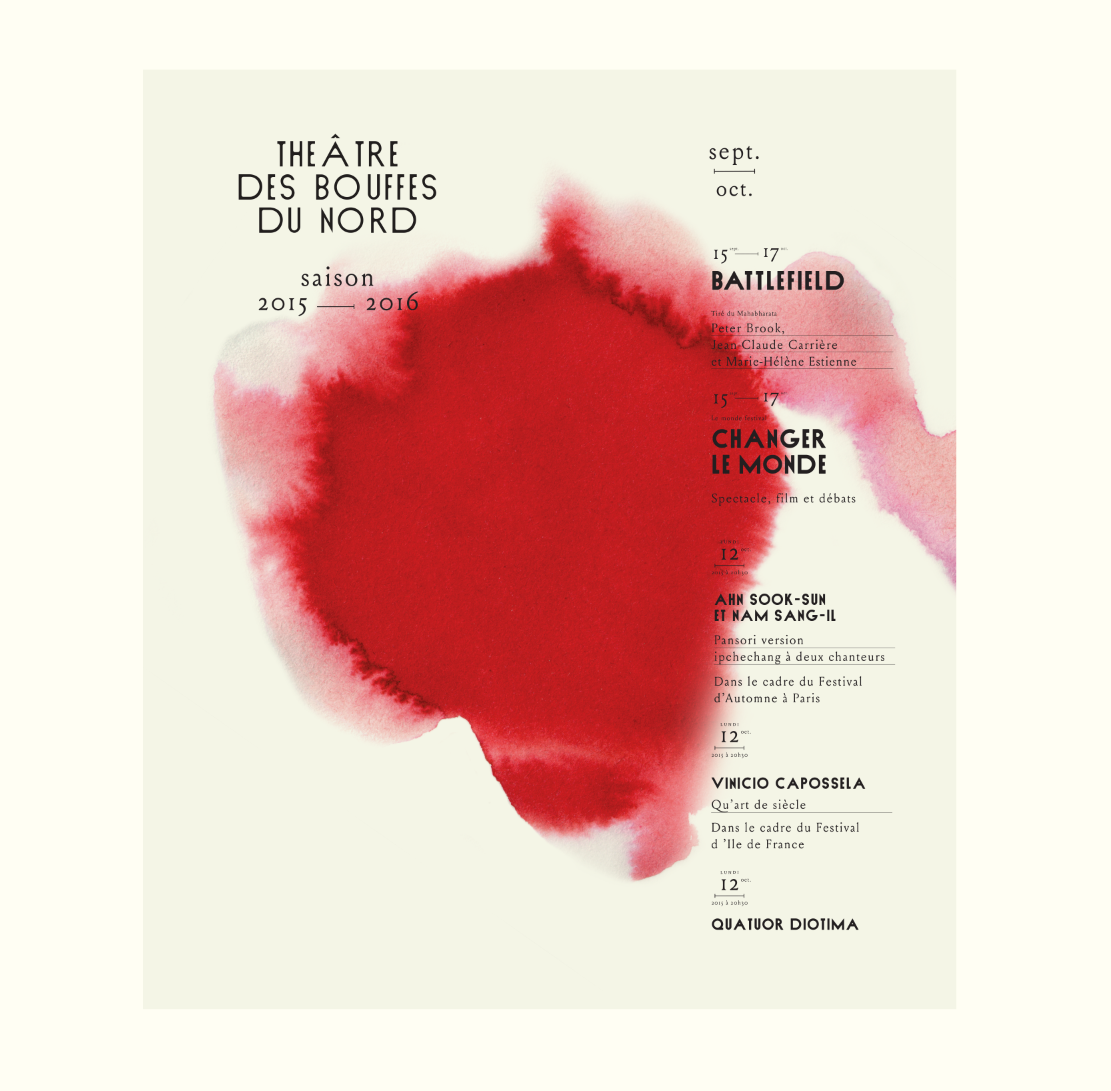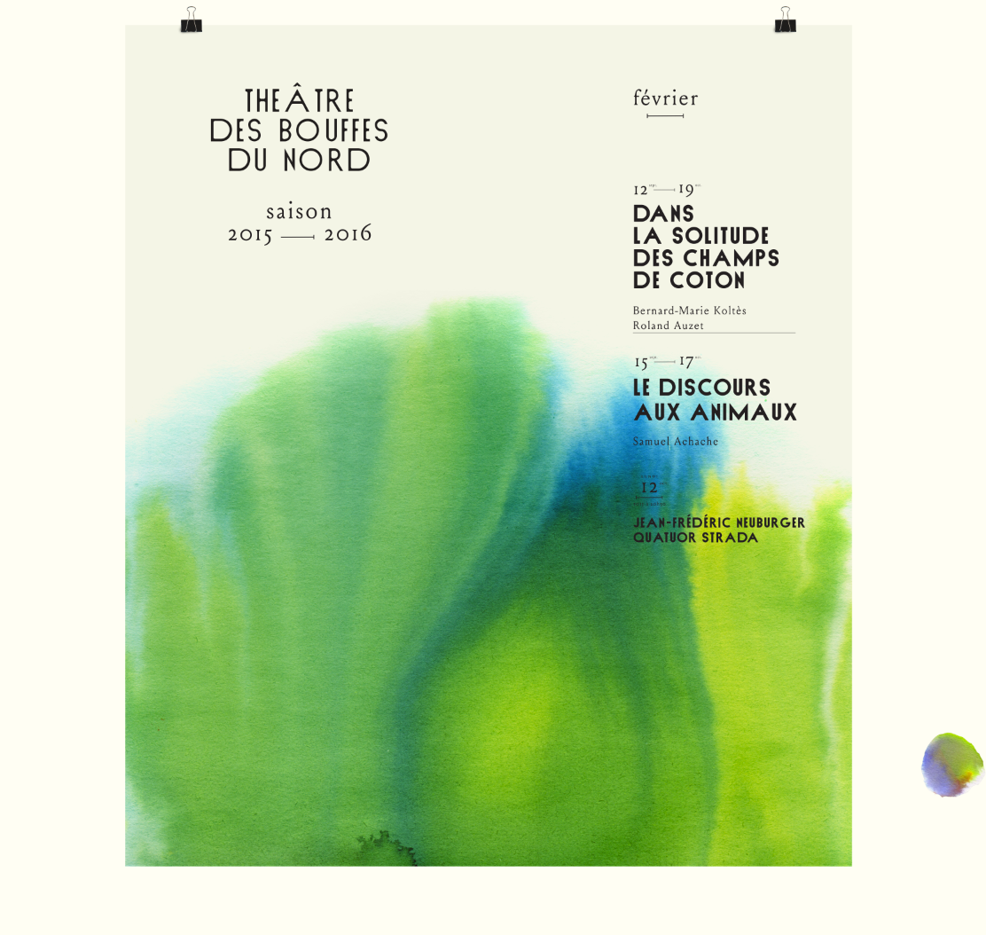 Parisian institution from 1876, Le Théâtre des Bouffes du Nord asked the duo to conceive an all new identity to follow the new season’s programme. This year, the concept of Colour was the general theme so they used different mediums to create a chromatic scale such as pigments, splashed ink and dripping watercolor, paying homage to Paris’ top painters. They were also asked to design the title fonts, so they conceived Nord (bold) and Sud (regular).