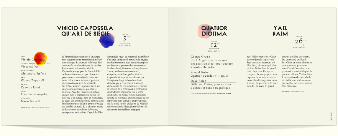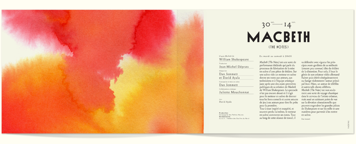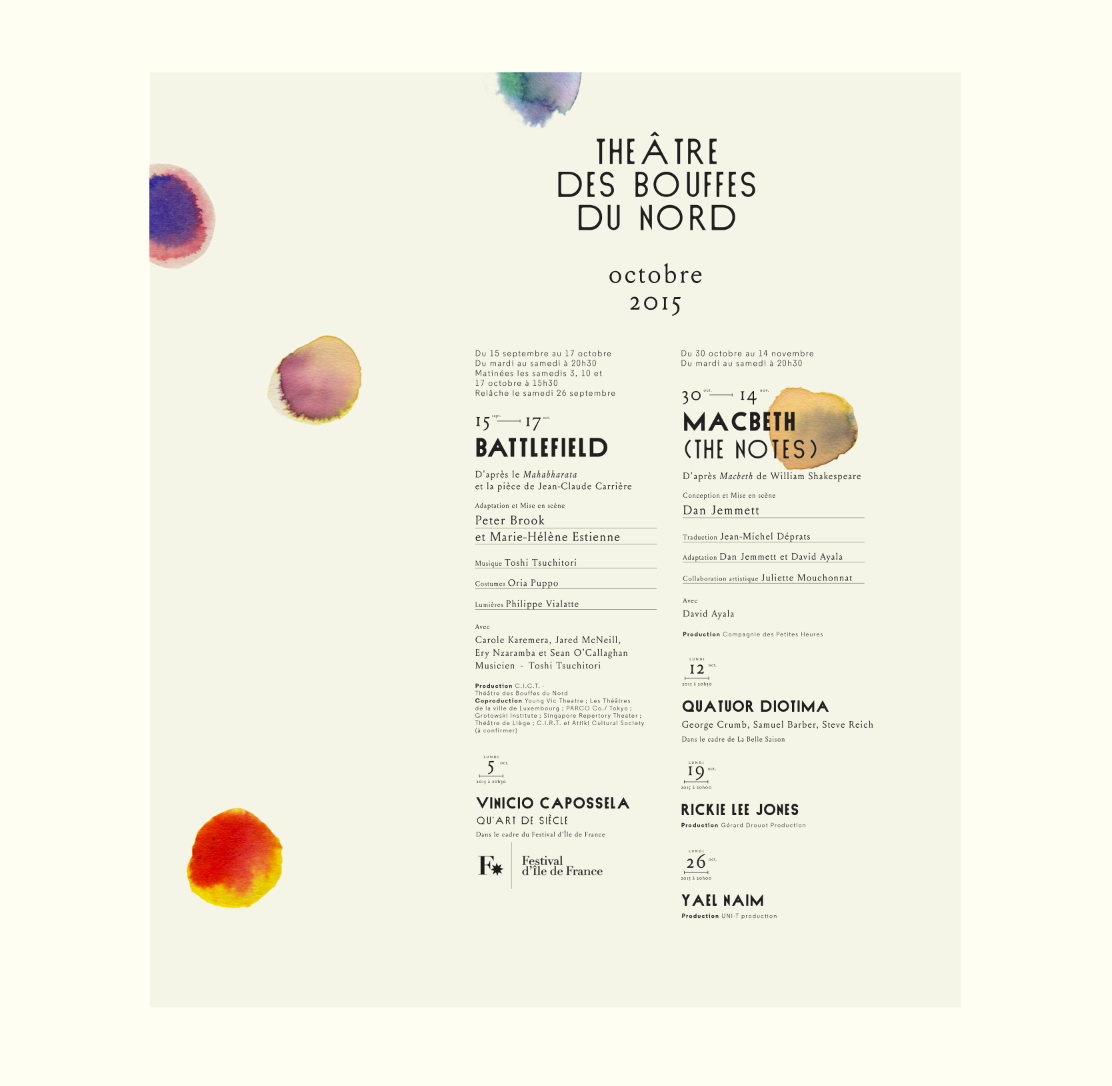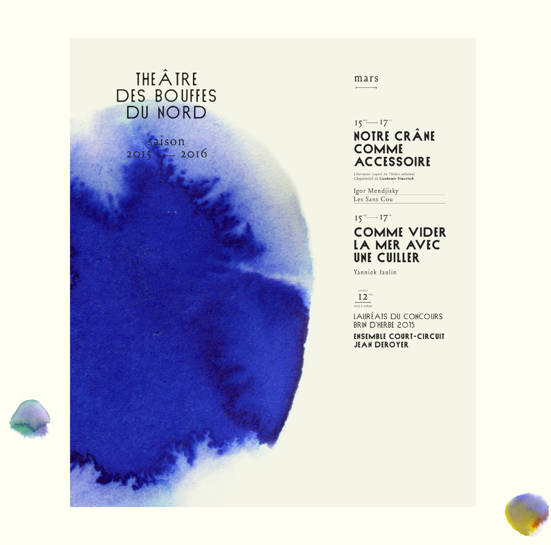 Parisian institution from 1876, Le Théâtre des Bouffes du Nord asked the duo to conceive an all new identity to follow the new season’s programme. This year, the concept of Colour was the general theme so they used different mediums to create a chromatic scale such as pigments, splashed ink and dripping watercolor, paying homage to Paris’ top painters. They were also asked to design the title fonts, so they conceived Nord (bold) and Sud (regular).