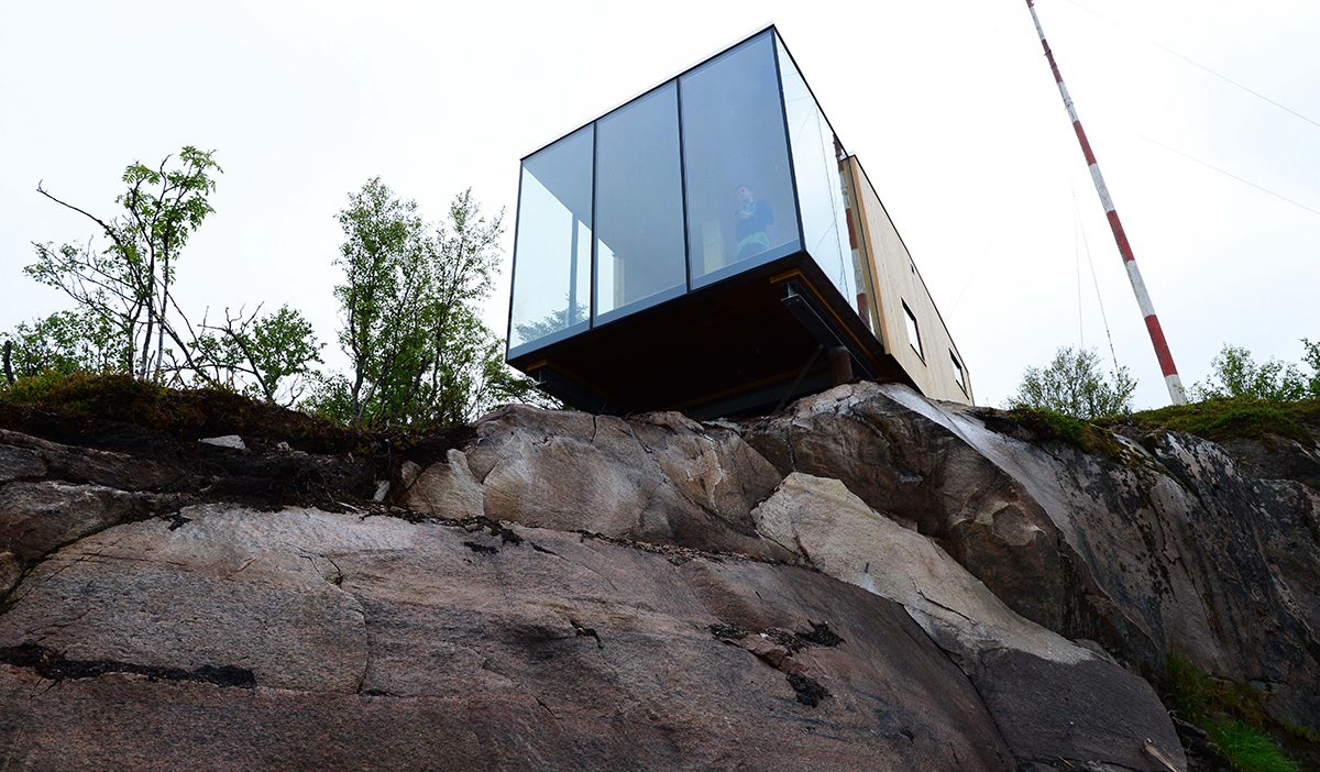 The cabins are designed to accommodate two to four people, or a family of five. The main bed is positioned in the main room, slightly withdrawn from the floor to ceiling glasses, to enable the visitor an around the clock experience of the dramatic outside elements (the sea, landscape, changing lights, weather and the passing of seasons), while still being comfortably sheltered.