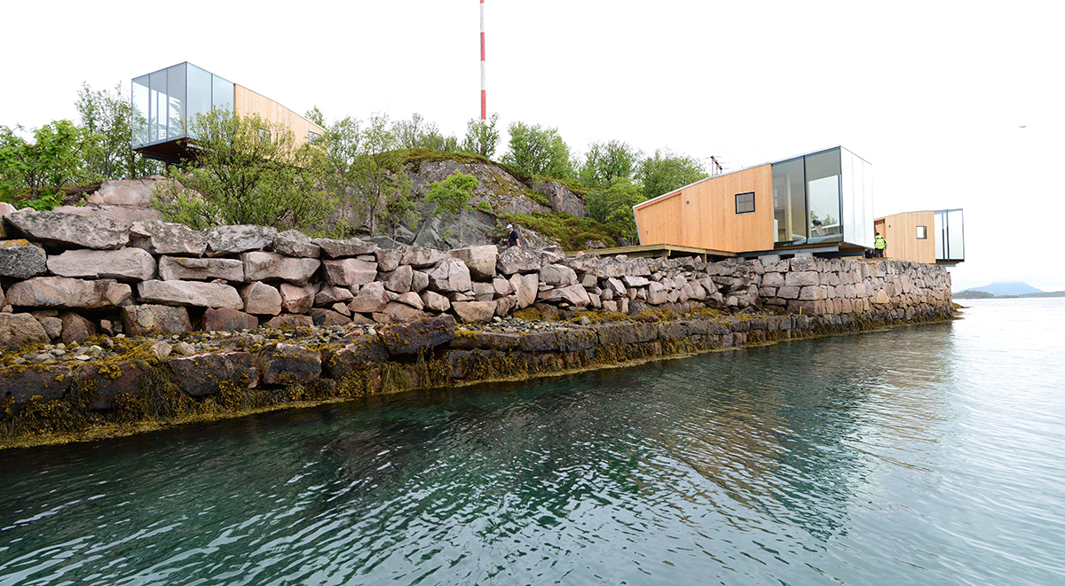 Quattro baite compongono il resort e tre di queste sono collocate sui moli in pietra, in parte sospesi sul mare, mentre la quarta si erge su di una piattaforma naturale al di sopra delle formazioni rocciose. L’orientazione di tutte le casette è stata studiata a fondo per ottenere la migliore vista panoramica individuale e la maggior privacy per gli ospiti.