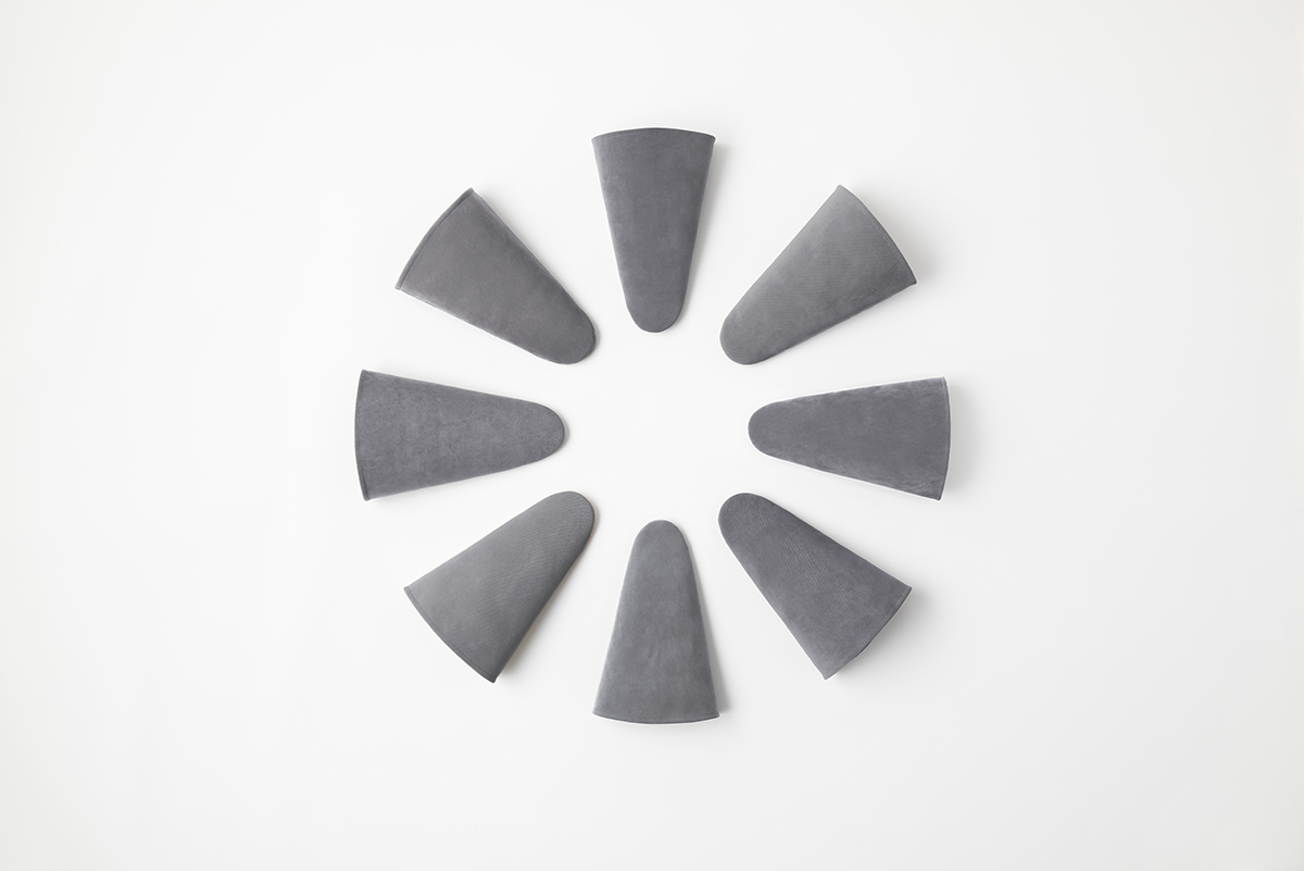 The last project by japanese design studio Nendo is a cone-shaped footwear that looks triangular from the side. A natural crease forms in its instep portion, and it offers a distinctive comfort to your feet unlike any shoes or slippers. It can stand on its own without taking too much space, and several can be stacked up in the foyer with no need for slipper racks. The studio selected two materials – polyester and synthetic leather – with the following in mind, comfort and steadiness when stood on its own.