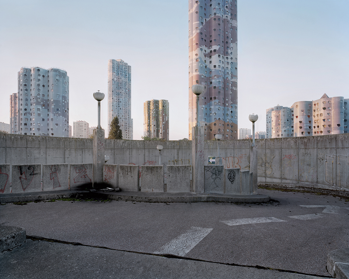 His photographs are tinted with melancholic, yet brave disenchantment. The majestic mass of the futuristic vessels seems to drift across an ocean of concrete. But the presence of old people, which might seem unexpected in such settings, paradoxically hints at a possible hope, as if past illusions were not all dead yet. Using a 4×5” analog camera, the artist highlights the architectural geometry without stamping out the details.