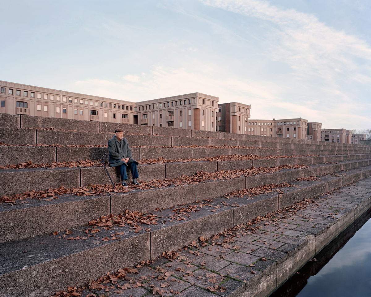 Le sue fotografie sono tinte di malinconia, ma al tempo stesso di coraggioso disincanto. La massa imponente delle navi futuristiche sembra andare alla deriva attraverso un oceano di cemento. Ma la presenza di anziani, che potrebbe sembrare inaspettata in tali contesti, suggerisce paradossalmente una possibile speranza, come se le illusioni del passato non fossero ancora tutte morte. Servendosi di una camera analogica 4×5”, l’artista ha evidenziato la geometria architettonica senza rinunciare al dettaglio.