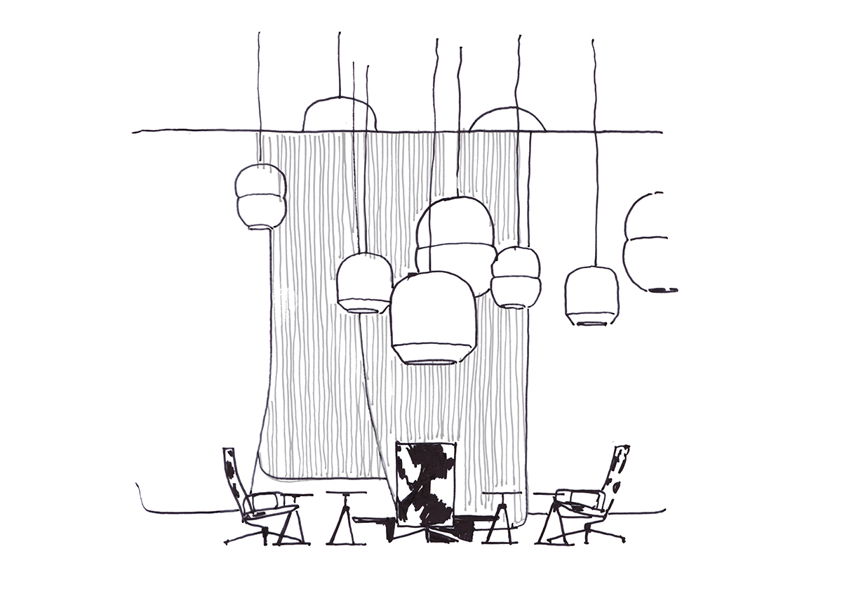 “Abbiamo organizzato lo spazio in 3 aree suddivise da grandi pannelli in feltro. Ogni spazio offre al visitatore la possibilità di rilassarsi, fare incontri di lavoro e lavorare sotto un tetto di lanterne di carta” hanno spiegato i due architetti.