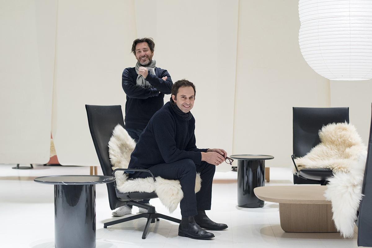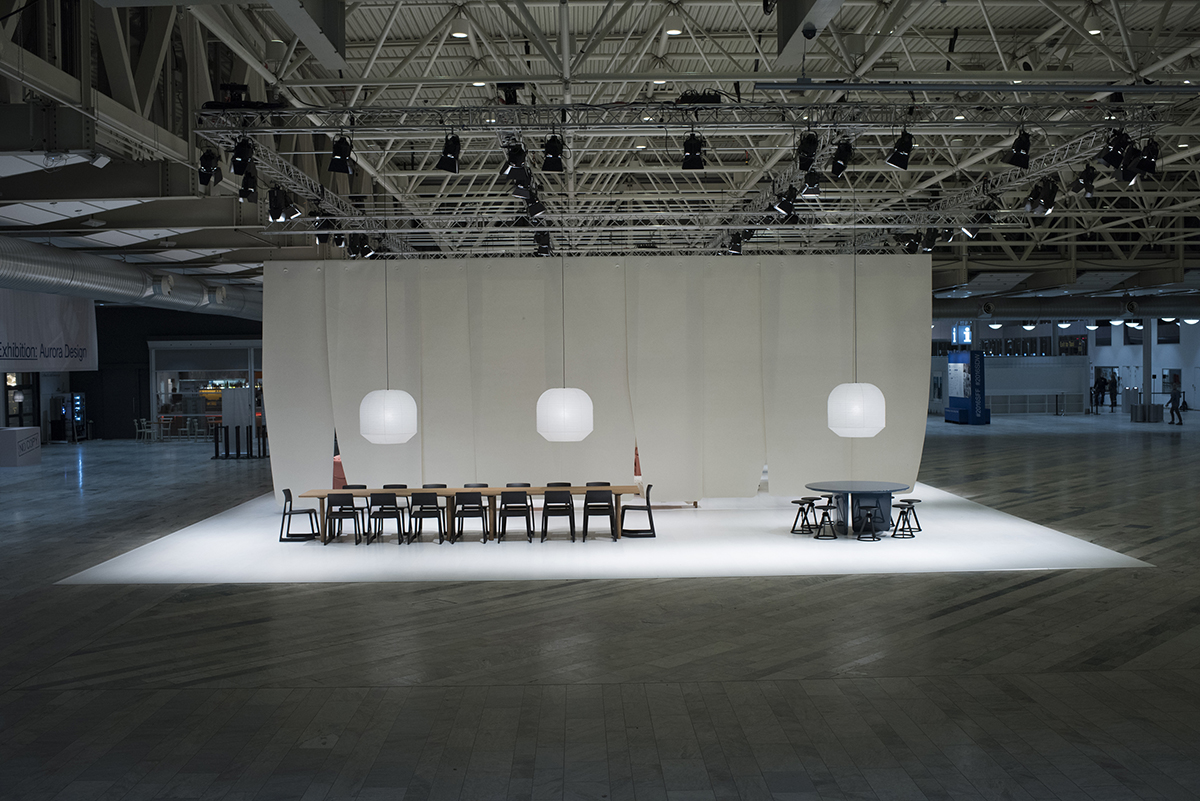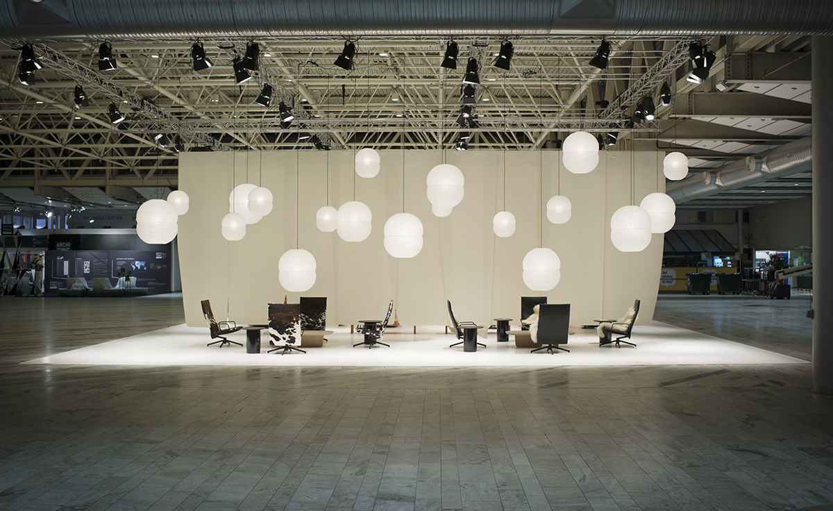 Triptych will consist of huge felt screens that create three areas, as well as animal hides on chairs and sheepskins on oak benches. These materials, set off by a white wood floor from Tarkett, reflect Edward Barber & Jay Osgerby’s impression of winters in Stockholm. The installation uses felt from Nordifa, known for their engineered textiles, furniture manufactured by Vitra, Knoll and B&B Italia and the Hotaru lantern collection manufactured by Ozeki.