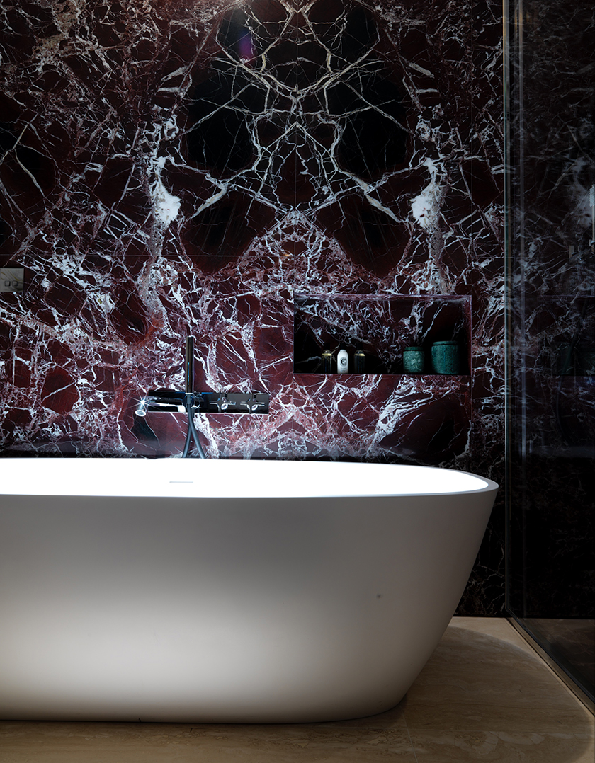 The seven hotel suites have been designed with maximum respect for the historical structure of the building, using characteristic elements and sumptuous materials: oak floors, precious limestones-painted wallpaper and bronzed brass elements for a contemporary re-interpretation of classic boi-serie, leather and rubber trees wood for custom furniture, Italian marble for the bathrooms.