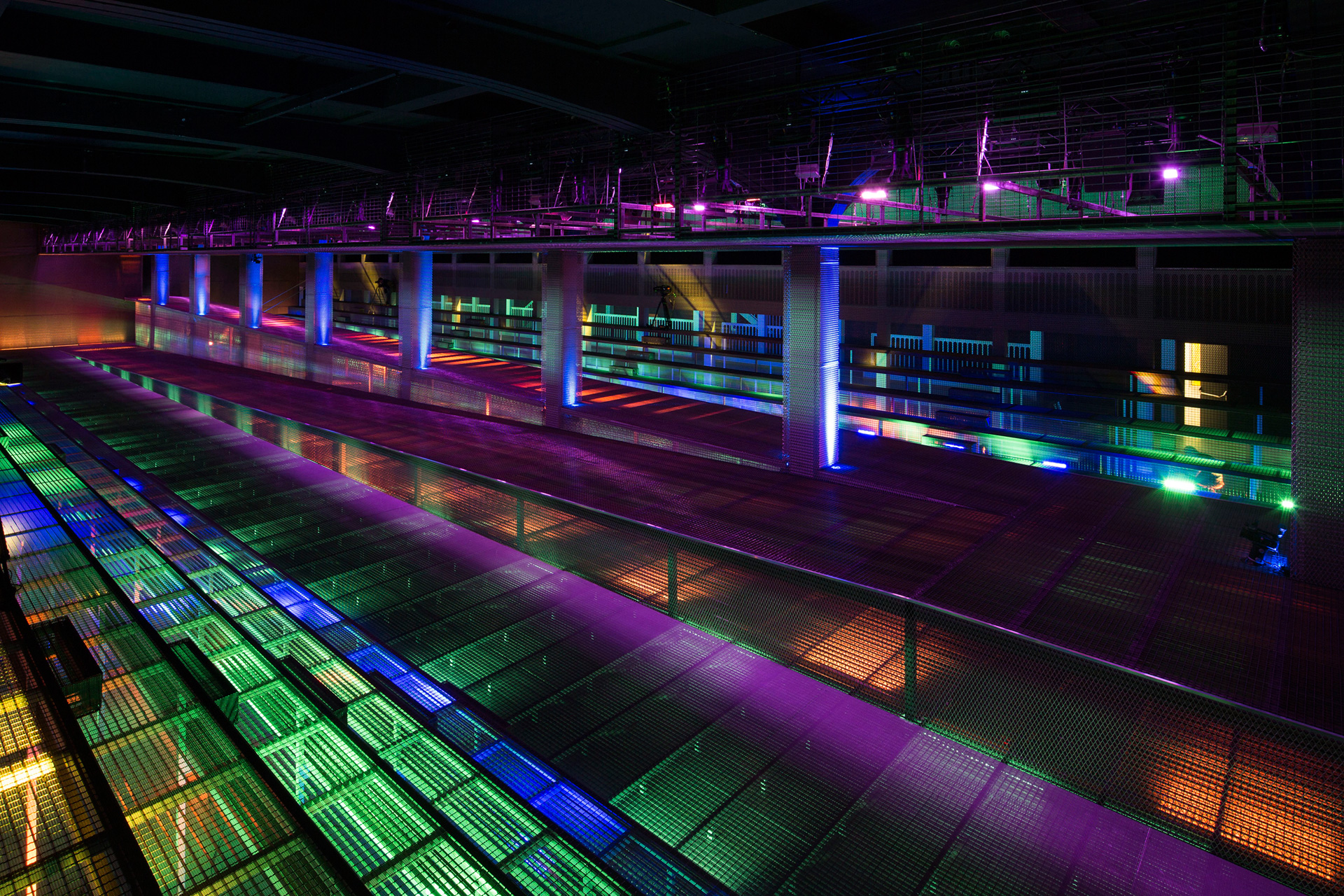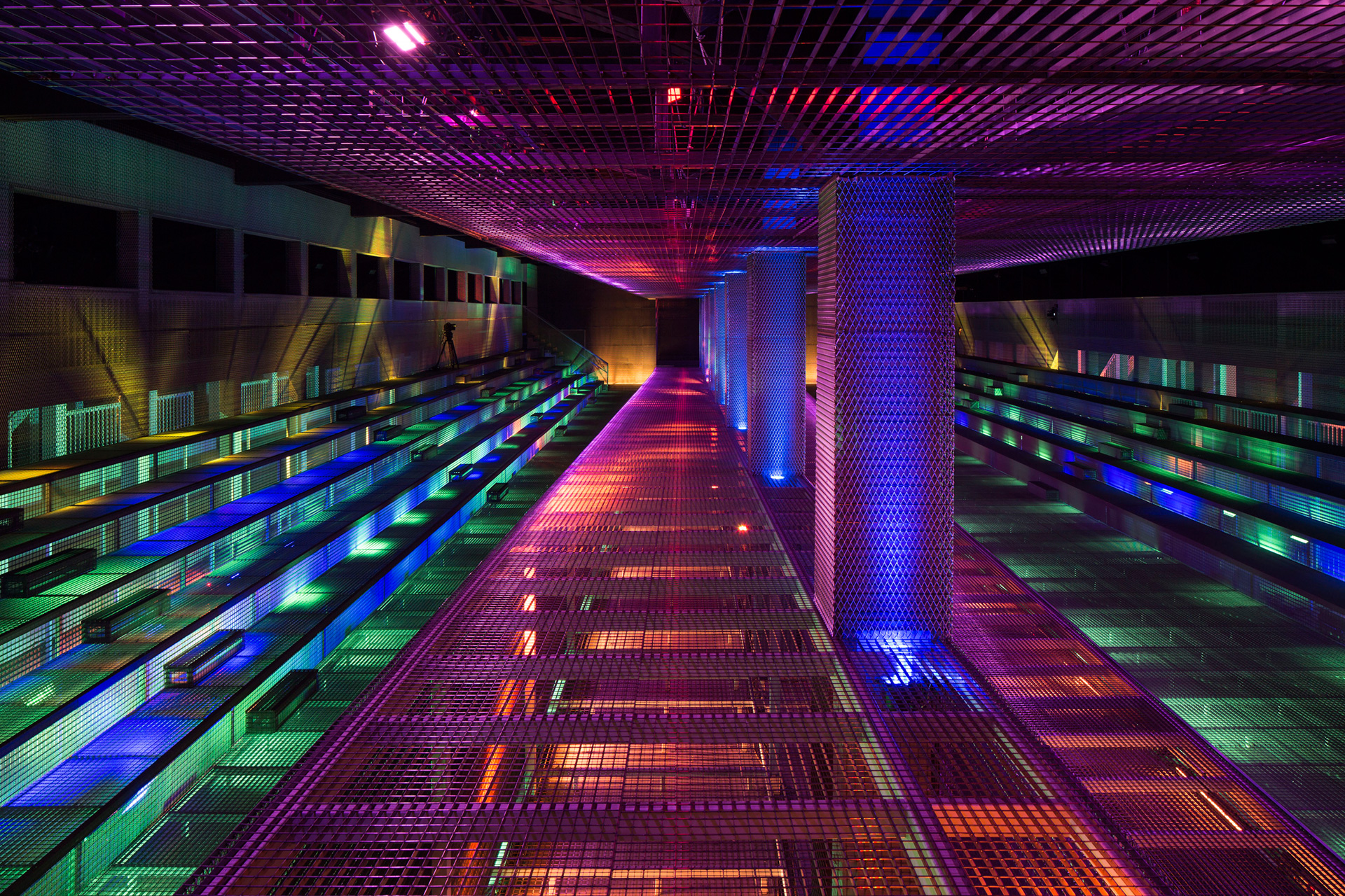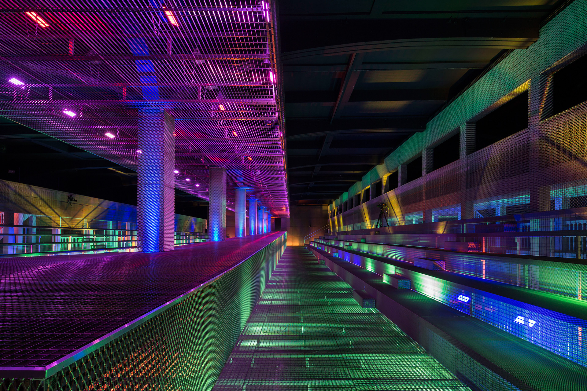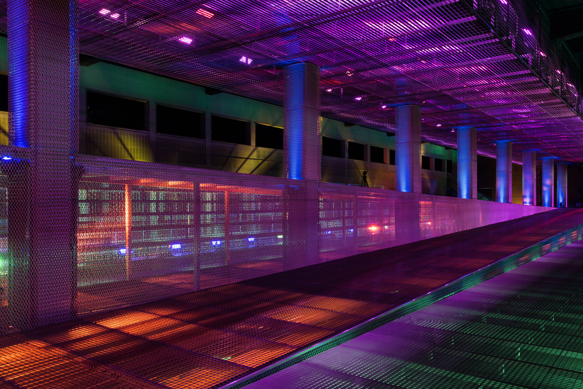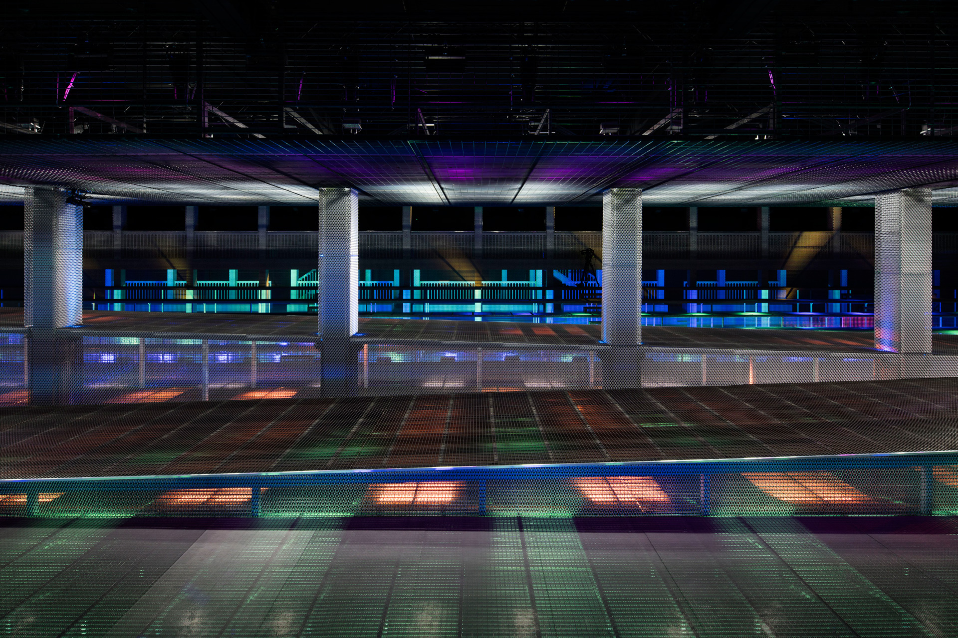 A continuous metallic surface folds around all the elements of the set: generating an abstract layer, composed of meshes with different patterns and dimensions that overlap to recreate a total space. The transparency of the cladding material unveils the underlying framework with Cartesian precision.