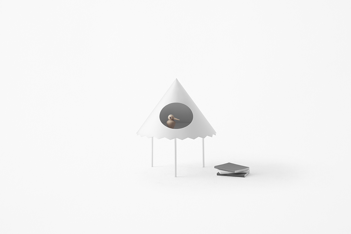 A collection of side tables which resemble triangular tents. The table can be placed by a sofa or bed, and the user can position the-round shaped opening to face them, which makes the table become a small personal alcove. The tables have inner lighting which highlights the items inside, making use as a display case also possible.