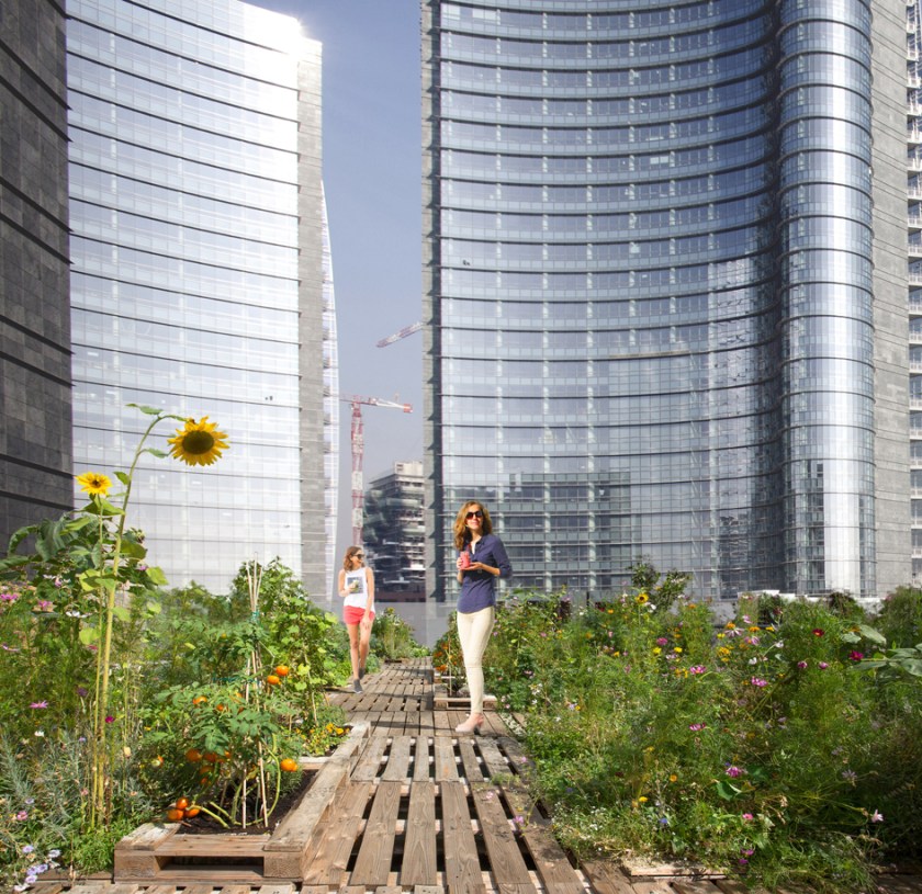 La forma sinuosa del complesso per uffici e attività commerciali, affacciato su piazza Gae Aulenti, si arricchisce infatti di un’idea che asseconda perfettamente la natura frenetica di Milano: trasformare il tetto in una terrazza verde, dal quale si possa ammirare lo scenario del nuovo skyline e, al contrario, essere visti dai piani alti delle nuove torri, migliorandone l’affaccio. Il “rooftop garden” è immaginato come uno spazio polivalente: un orto in quota, che porta il tema dell’agricoltura in città, aperto al pubblico e dotato di un servizio di ristorazione che utilizza i prodotti coltivati in loco; un luogo per spettacoli e manifestazioni o ancora una palestra all’aperto per discipline sportive o pratiche meditative.