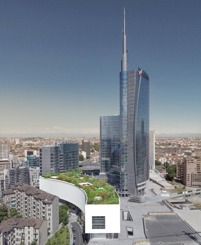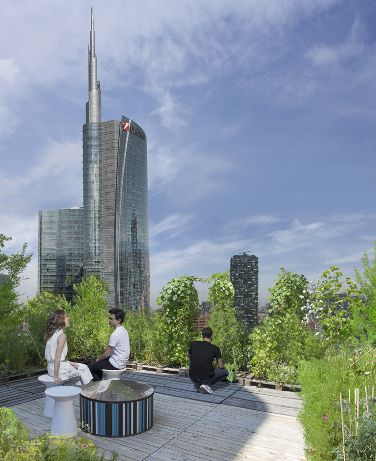 La forma sinuosa del complesso per uffici e attività commerciali, affacciato su piazza Gae Aulenti, si arricchisce infatti di un’idea che asseconda perfettamente la natura frenetica di Milano: trasformare il tetto in una terrazza verde, dal quale si possa ammirare lo scenario del nuovo skyline e, al contrario, essere visti dai piani alti delle nuove torri, migliorandone l’affaccio. Il “rooftop garden” è immaginato come uno spazio polivalente: un orto in quota, che porta il tema dell’agricoltura in città, aperto al pubblico e dotato di un servizio di ristorazione che utilizza i prodotti coltivati in loco; un luogo per spettacoli e manifestazioni o ancora una palestra all’aperto per discipline sportive o pratiche meditative.