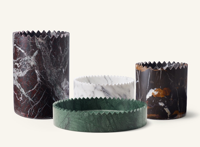 A collection of vases, sculpted from blocks of marbles, they are imagined like crowns, making them both fragile and majestic, serious and playful, they create an element of surprise to a space while seeming endlessly classic.