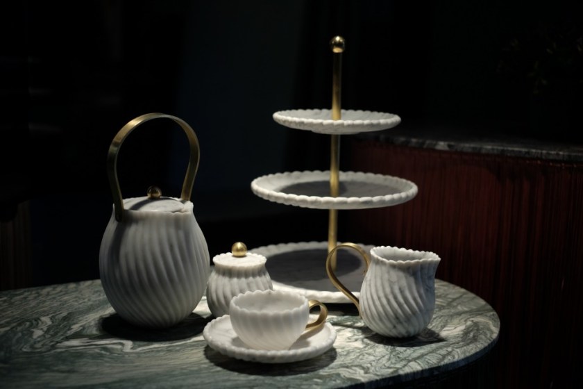 Victoria celebrates the ritual of drinking tea, merging a classic British tradition, with a classic Italian material – marble. The collection features a relief pattern, hand- carved from arabescato marble by Italian master craftsmen.
