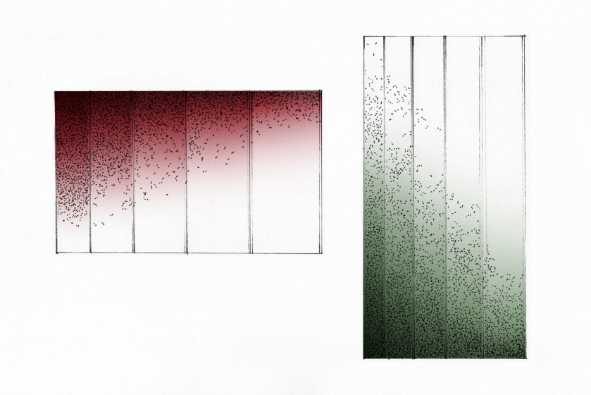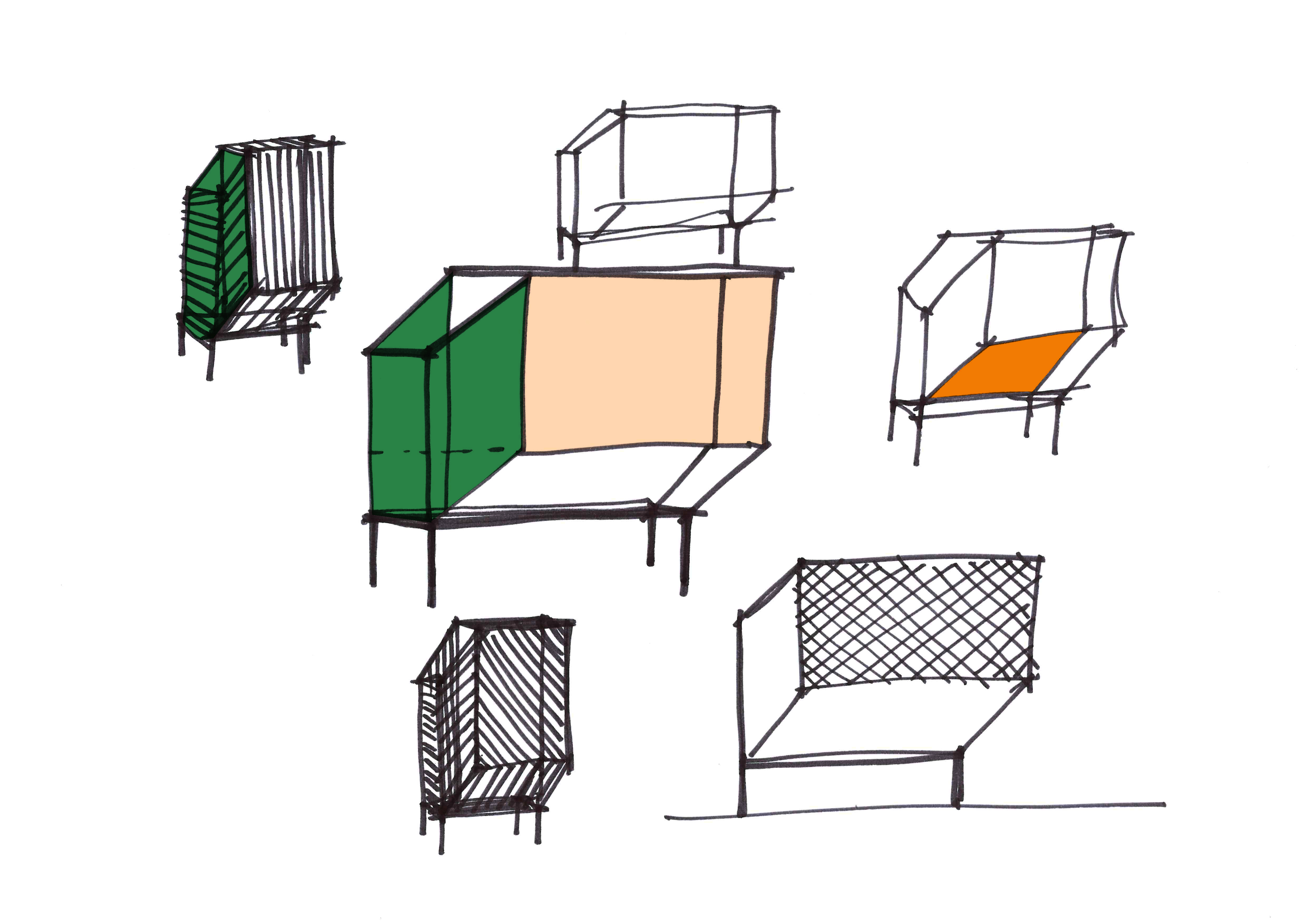 Sketches for Miscredenza by Federico Pepe + Patricia Urquiola. Miscredenza is a series of little architectural furniture, small geometries for every day use enhanced by coloured glass printed with Federico Pepe’s patterns.