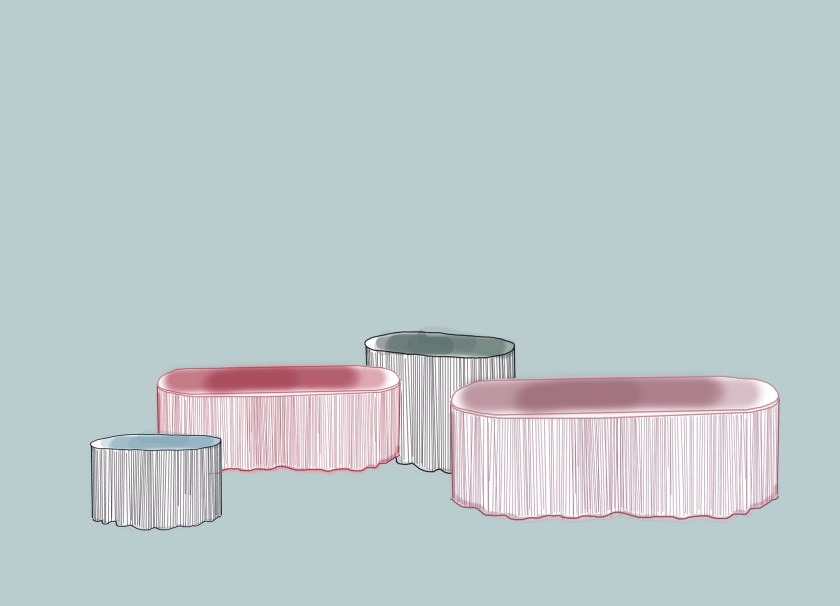 Sketch for Tripolino collection by Cristina Celestino. Series of low tables in marble and fringes in chromatic contrast.