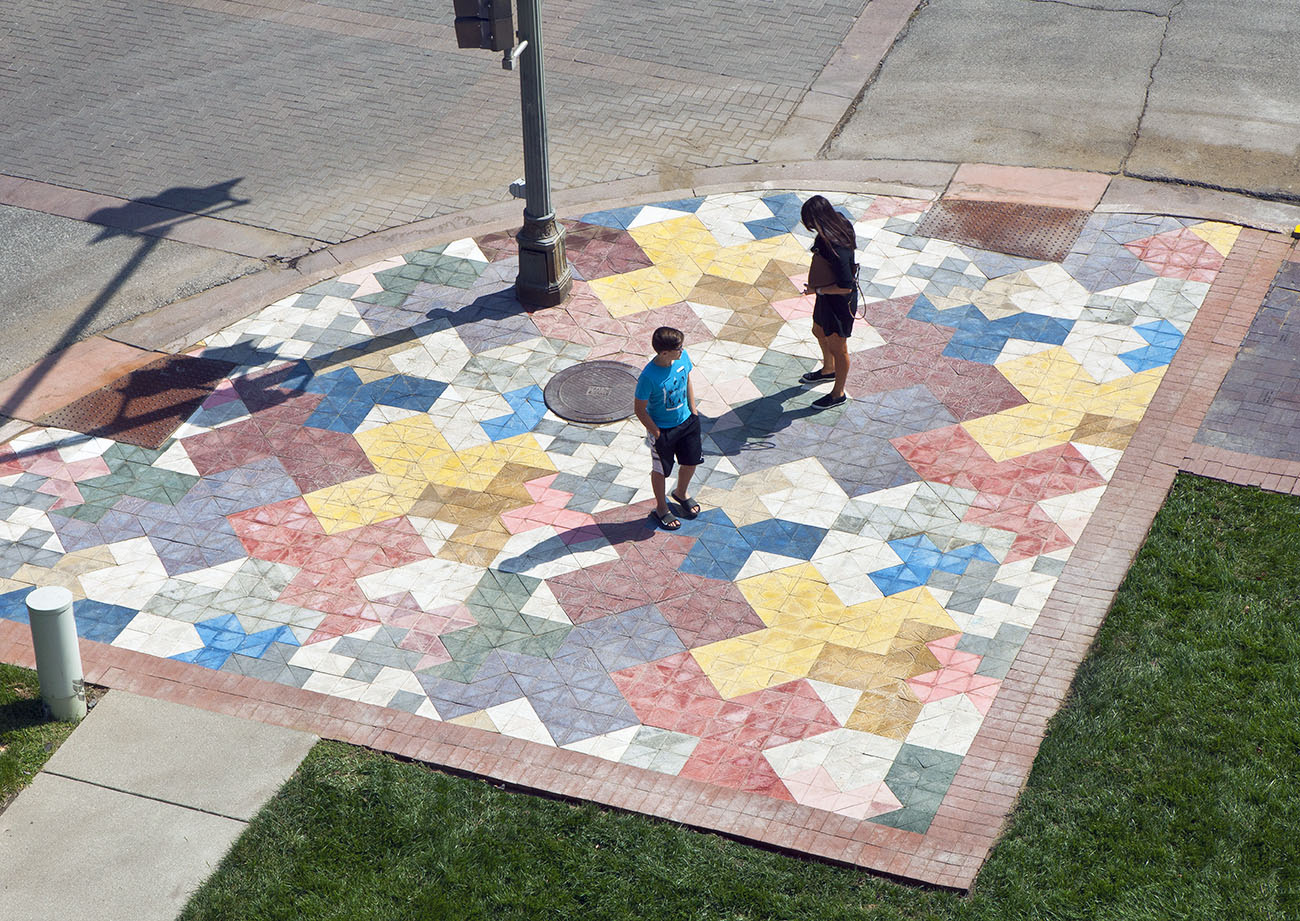Cody Hoyt’s installation transforms the corner of Seventh Street and Washington Street by replacing more than 2500 existing monochromatic sidewalk bricks with new and brightly colored concrete bricks fabricated in Columbus.