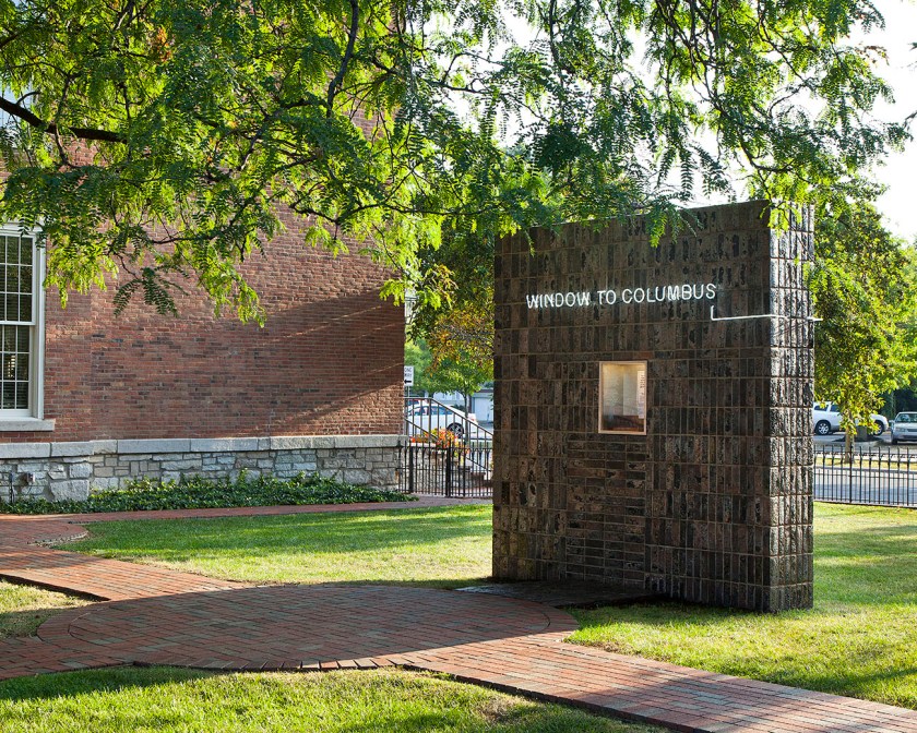 Window to Columbus is a volcanic glazed brick wall with an inset window. This window will serve as a mini-museum with a fortnightly exhibition telling stories about the materials that have helped to define Washington Street and the architecture of Columbus at large.