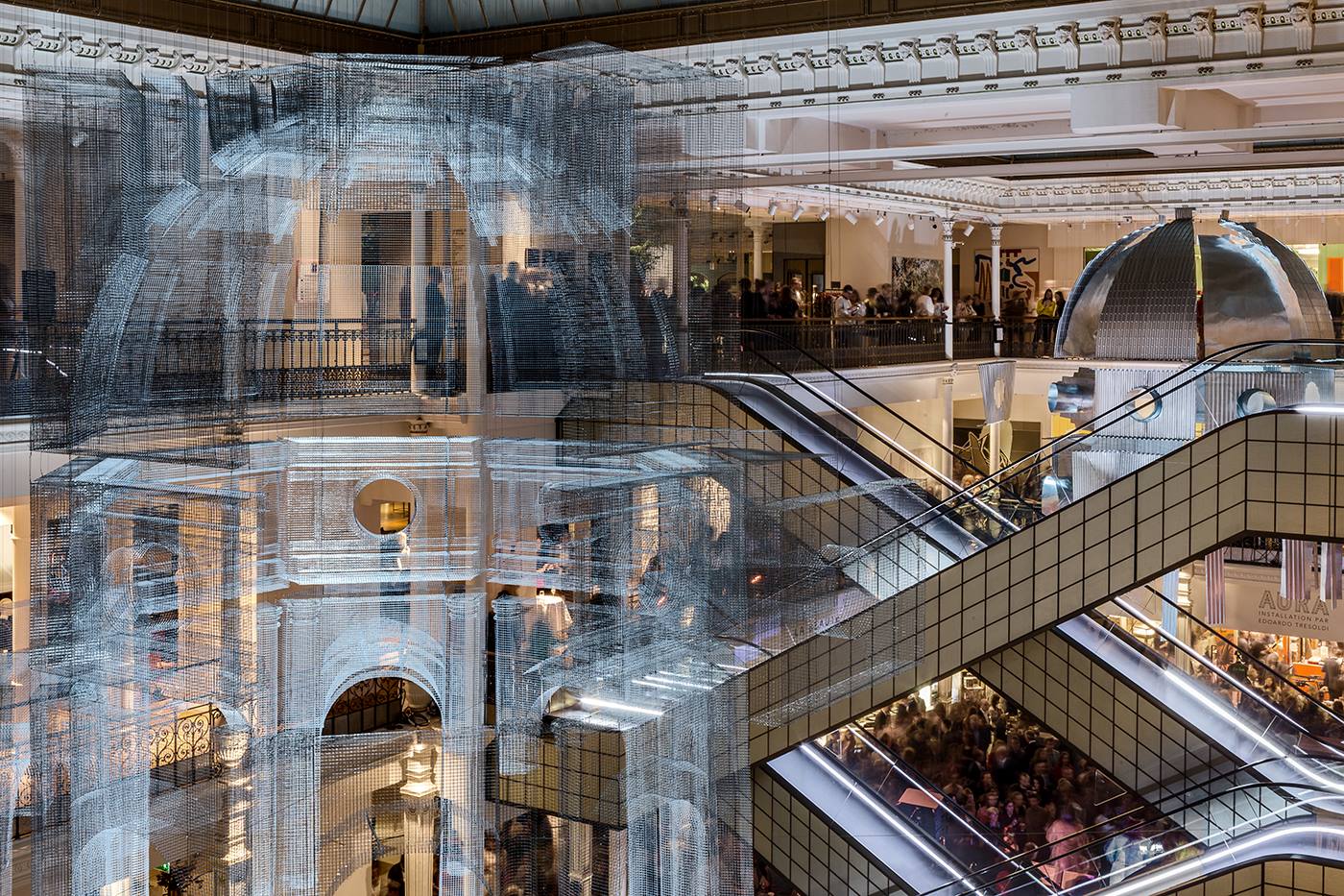 You will see the ephemeral installation is composed of two domes, one in wire mesh and one in corrugated sheet metal, a new material for the artist, used here for the first time. They both are suspended from the majestic glass ceilings designed by Gustave Eiffel, and required five nights of work.
