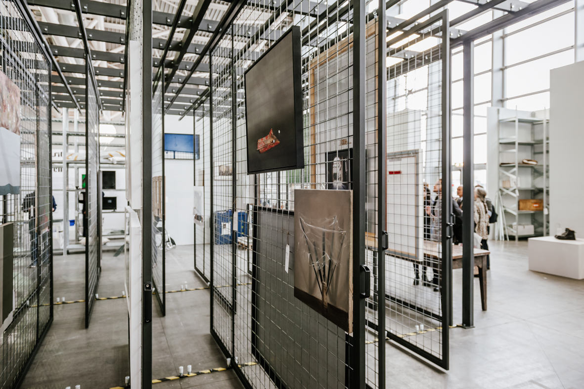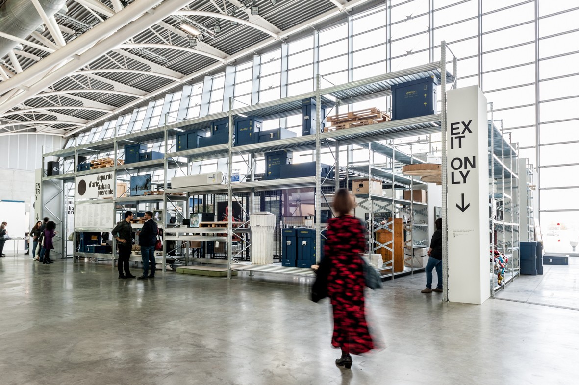 Per il Deposito d’Arte Italiana Presente, Vudafieri e Saverino hanno disegnato un contesto che vuole richiamare i depositi d’arte nel quale lo spazio è costruito attraverso scaffalature metalliche, casse di legno e pallet sui cui sono disposte le opere d’arte: proprio come se fossimo all’interno di un deposito.