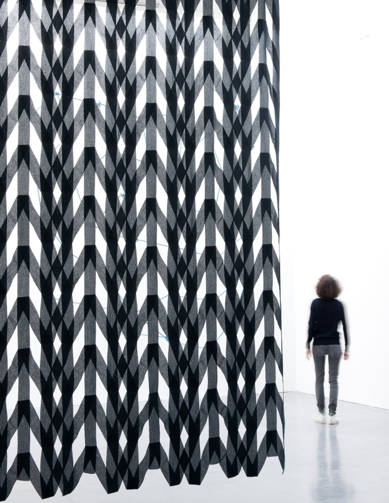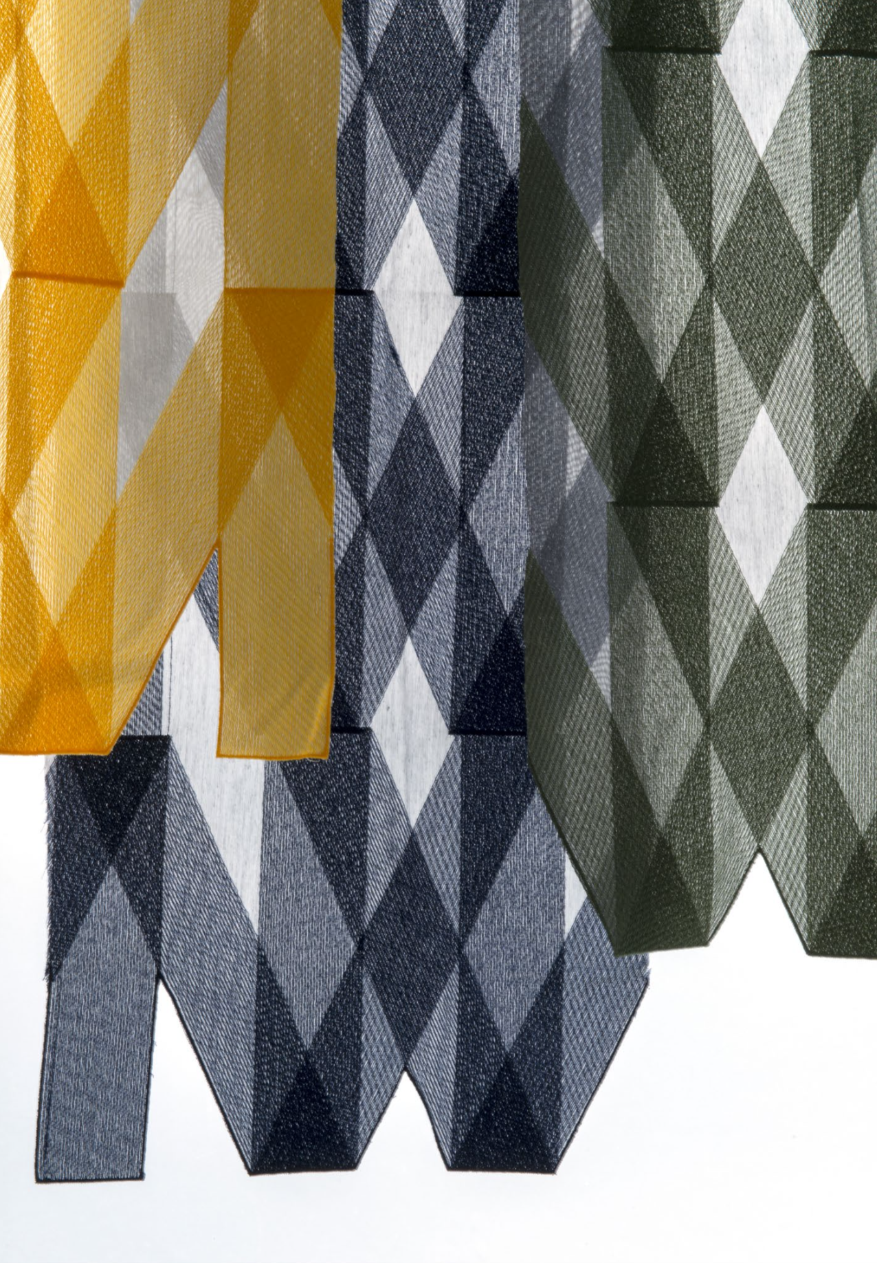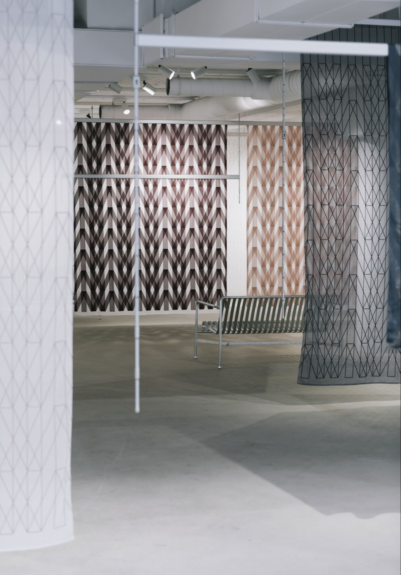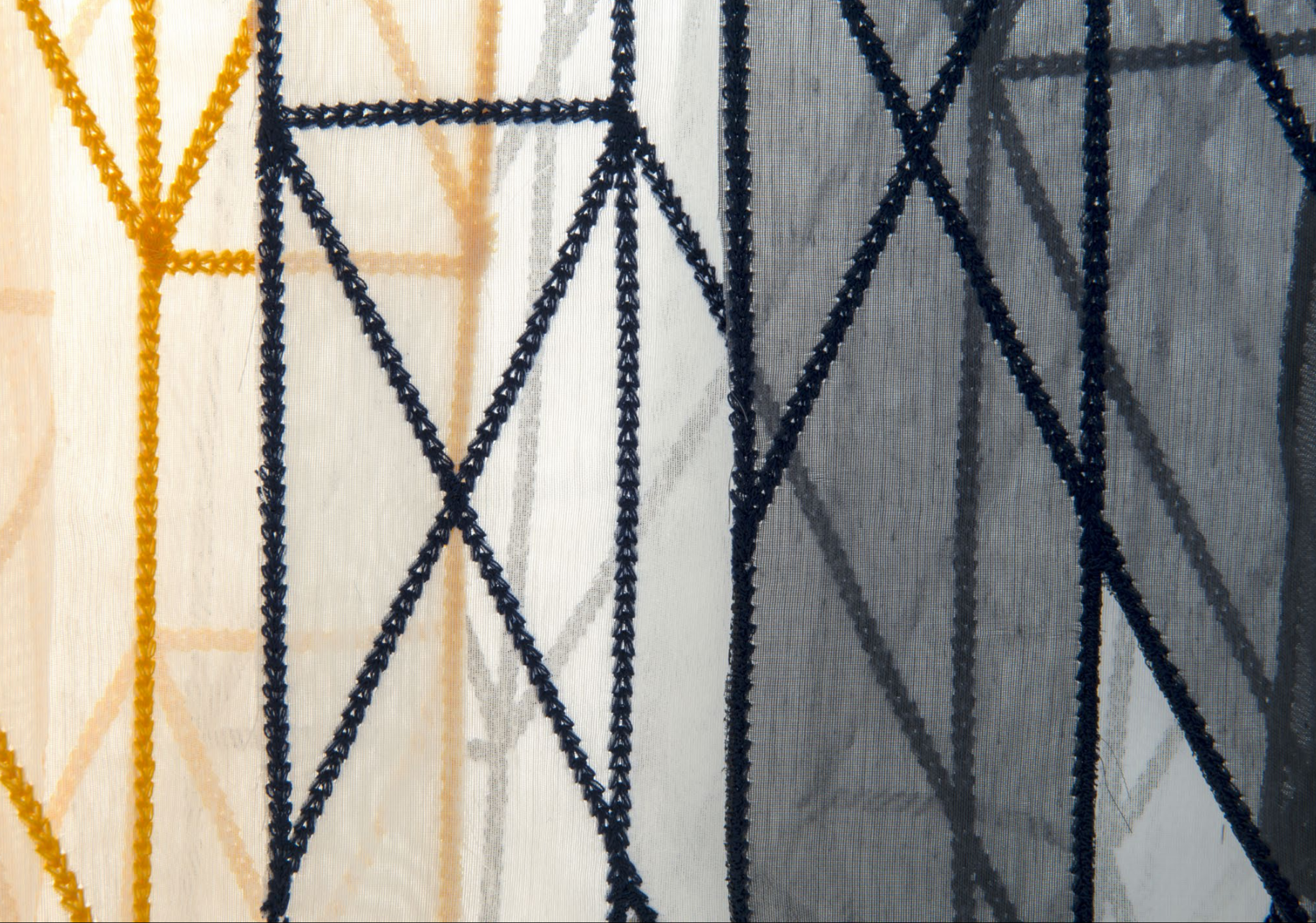 Embroidery, even mechanical, has a very subtle way of enhancing the curtains and what happens when you see through. The yarns somehow model the surface while informing very smartly the colors. It still conveys a certain memory of old handcrafted embroideries, but the approach to patterns and the context of Kvadrat brought the duo to this very engineered and precise technique.