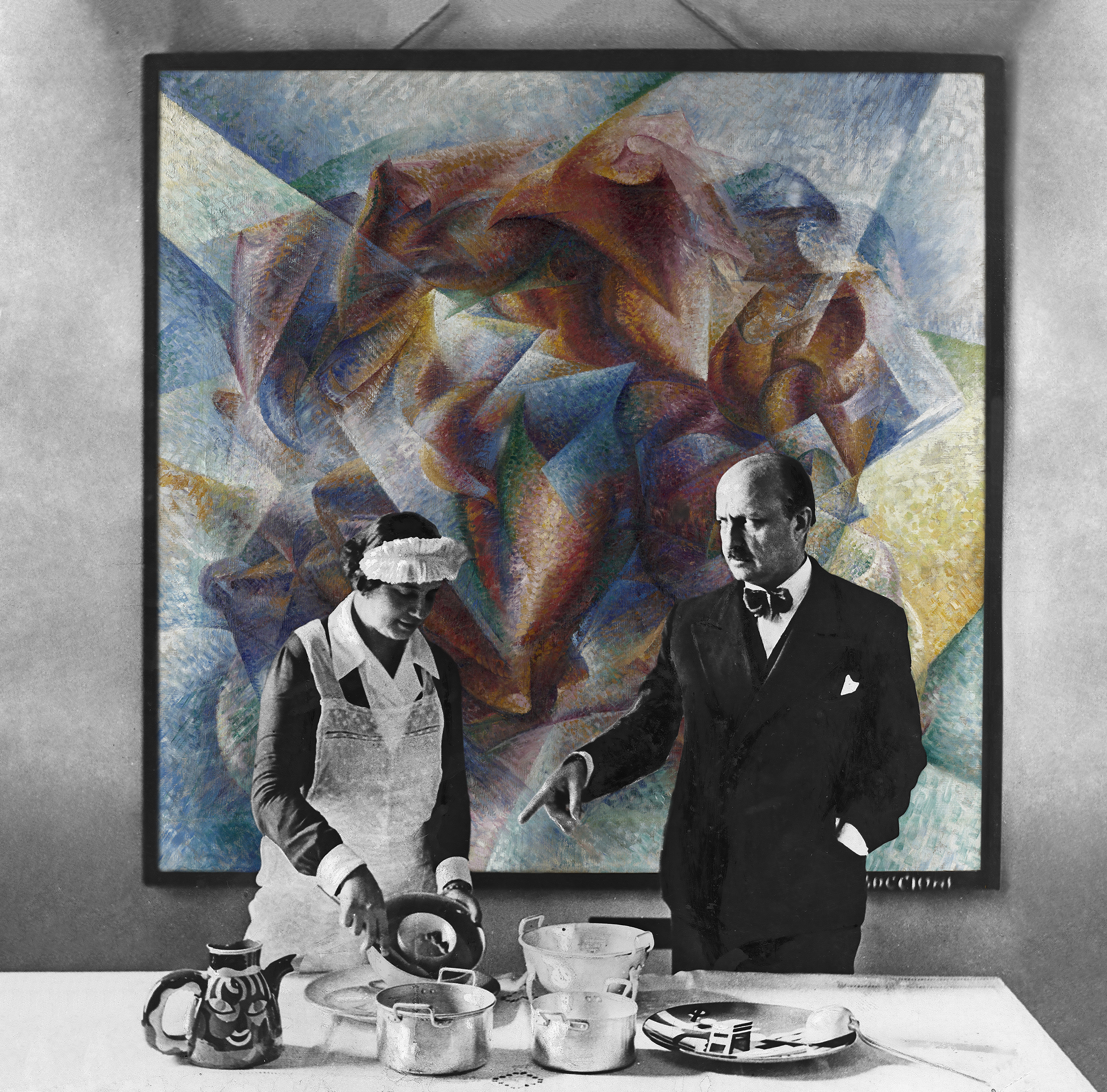 Rendering fotografico per “Post Zang Tumb Tuuum” (Fondazione Prada, Milano, 2018) Filippo Tommaso Marinetti nella sua casa (da “Wiener Illustrierte Zeitung” e “Berliner Illustrierte Zeitung”, 1934) con sullo sfondo “Dinamismo di un footballer” di Umberto Boccioni, 1913. Ullstein Bild / Archivi Alinari © 2017. Digital Image, The Museum of Modern Art, New York / Scala, Firenze