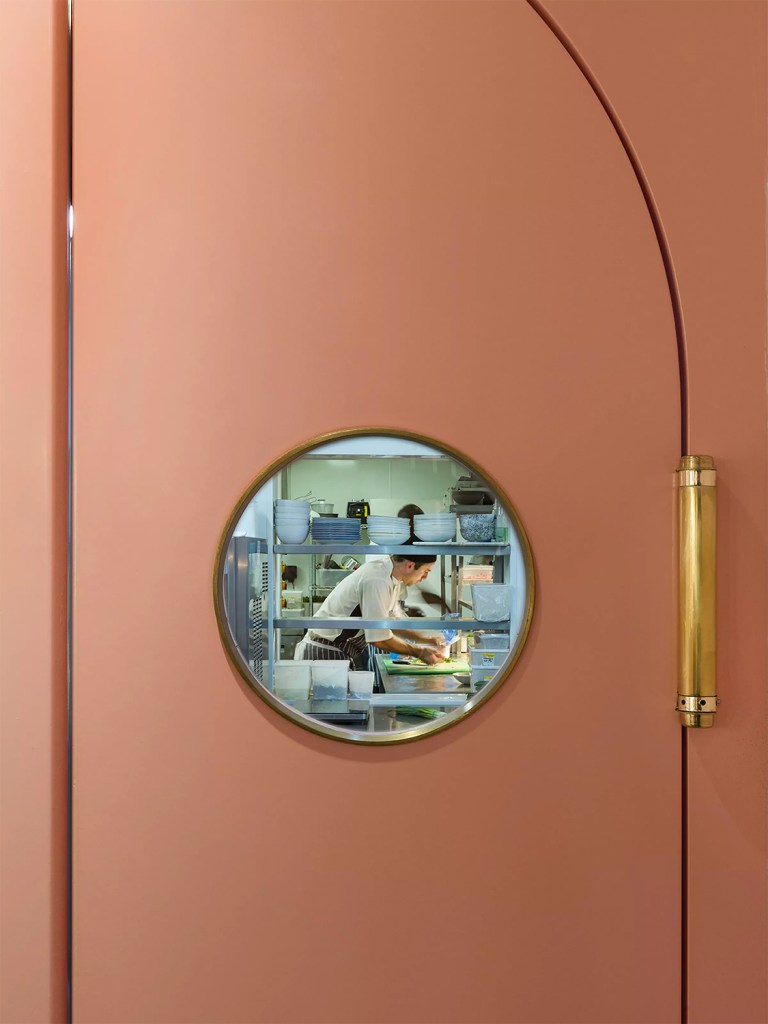 They chose a pastel pink tone for the low-ceiling, windowless space, furnishing it with velvet emerald green sofas, marble tops, bespoke brass lighting and see-through partitions. All inspired by 1940’s Hollywood.