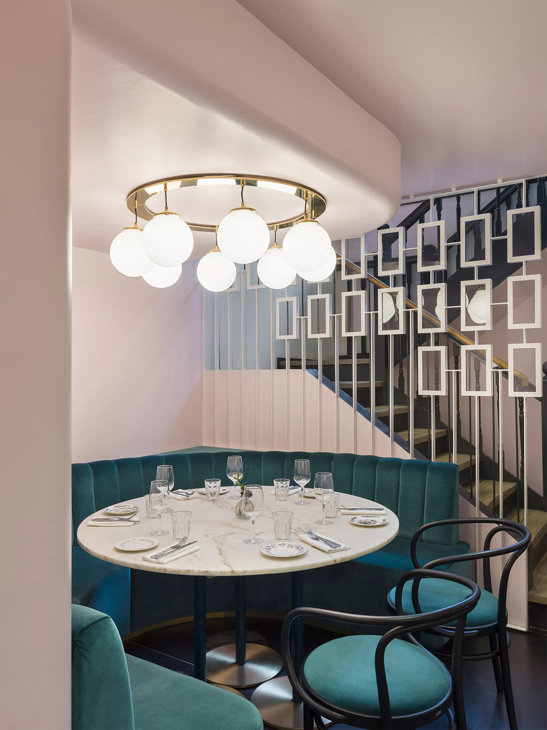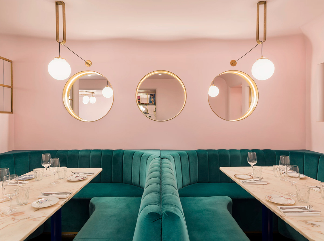 They chose a pastel pink tone for the low-ceiling, windowless space, furnishing it with velvet emerald green sofas, marble tops, bespoke brass lighting and see-through partitions. All inspired by 1940’s Hollywood.