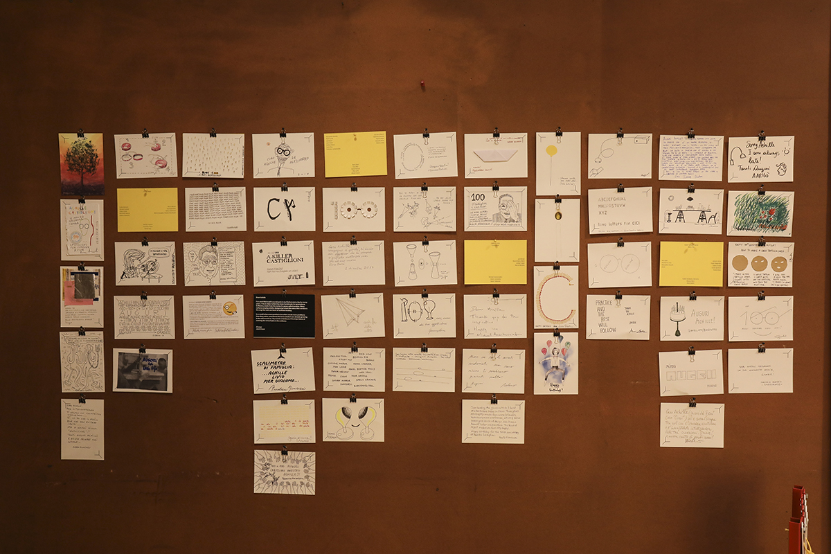 Per l’occasione, la fondazione fondata e guidata da orami dieci anni da Giovanna e Carlo Castiglioni, ha invitato più di 100 designer, tra rinomati ed emergenti a scegliere un oggetto sconosciuto, economico e anonimo da donare idealmente ad Achille per il suo centesimo compleanno. A tutti i designer è stato recapitato anche un invito sotto forma di cartolina, e gli è stato chiesto di trasformarlo in un biglietto di auguri, in un’operazione di ready made “alla Castiglioni”.