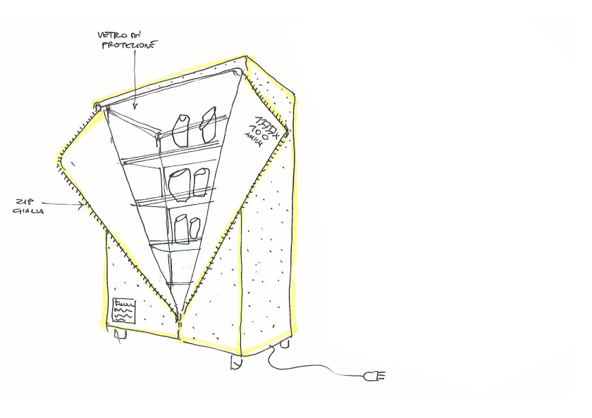 “Con un approccio progettuale che mescola allegoria e sintesi, l’oggetto-simbolo diventa tavolo espositore ed espositore da parete, per accogliere le varie tipologie dei regali per Achille. Immediato il rimando alla famosa “vetrina/armadio delle meraviglie” cuore dello Studio Achille Castiglioni, che, di citazione in citazione, completa il nostro atto di omaggio alla figura del maestro e al suo pensiero diventato preziosa eredità”.