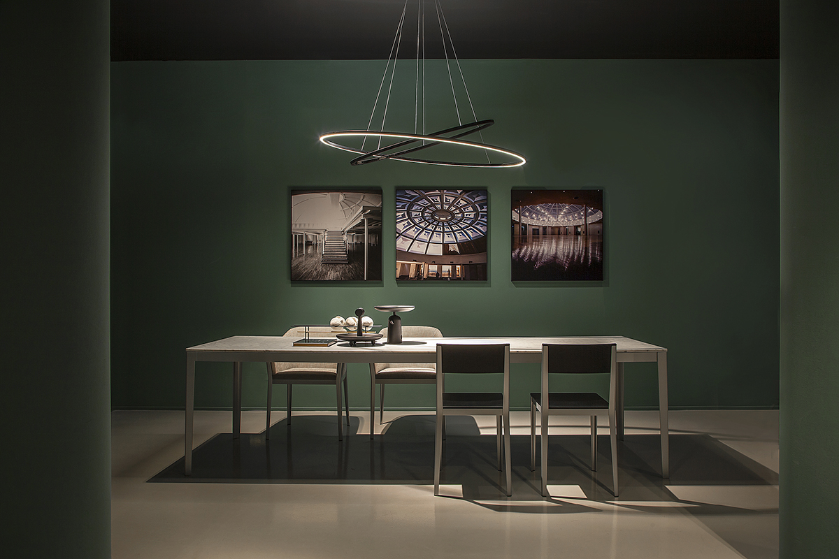 Materiali tradizionali sono reinterpretati in chiave contemporanea. Il seminato veneziano, che separa le due ali laterali dello showroom rivestite in parquet, funge da passerella di ingresso, conducendo alla nuova scala elicoidale in ferro verniciato: una lamiera metallica sottile si avvolge, con un gesto spazialmente rigoroso, verso la cupola sovrastante.