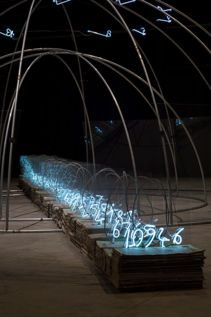 In the Navate, the exhibition itinerary is marked by a series of neon numbers, Numeri di Fibonacci, 2002, which extends along the entire length of the bridge crane, integrating with the former industrial architecture of Pirelli HangarBicocca. While the igloos are displayed inchronological order, starting from the first ones conceived in the ’60s such as, to name but a few: Igloo di Giap, 1968, and Acqua scivola, 1969. Among those of the ’70s, Igloo di Marisa,1972 and If the hoar frost grip thy tent Thou wilt give thanks when night is spent, 1978 are featured here. The evolutions of the ’80s, the period in which the igloos become more complex,doubling, tripling or intersecting, are represented by works such as: Igloo del Palacio de las Alhajas, 1982 and Chiaro oscuro / oscuro chiaro, 1983. Representative of the ’90s is theSenza titolo (doppio igloo di Porto), 1998, created for the museum park on the occasion of the solo show at the Fundação de Serralves, also curated by Vicente Todolí. 74 gradini riappaiono in una crescita di geometria concentrica, 1992, an artwork consisting of eight igloos formed by intersecting metal rods and stone blocks on the ground, is installed in the outer space of Pirelli HangarBicocca. This work highlights the artist’s practice of carrying out interventions, not only in museum settings, but also in urban and natural locations, creating an intense relationship between landscape and sculpture.