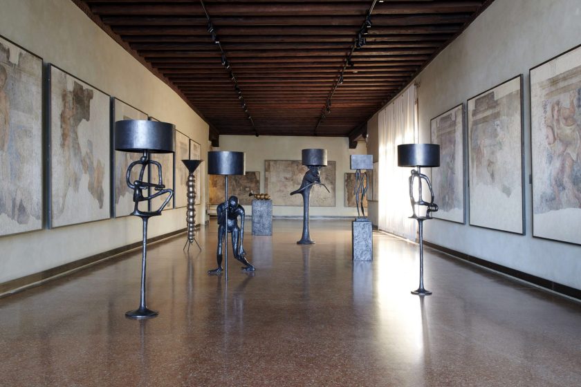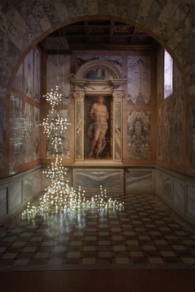 Forming a dialog with Ca’ d’Oro’s permanent art collection is Doors of Paradise (2019) by Vincent Dubourg, which interacts with a bas-relief from the 10th-12th centuries that were created to ward off bad spirits. Working for the first time with clay, the artist randomly places layers of clay to form a door that obscures the view. Ode (2019), a 17-metre-long wall made of recycled fiberglass and silver-plated brass by Vincenzo De Cotiis, works as an archaic architectural gesture and conceptualizes the space. The sculpture is megalithic and echoes its surrounding artworks. Fragile Future 3 (2019) by Studio Drift forms a frame of light around Andrea Mantegna’s painting San Sebastian (1506), which is the heart of the museum’s collection and for which Franchetti built a chapel decorated with marble. The light installation, which is made of fragile dandelion seeds and LEDs, invites the viewer to rethink our connection with nature.