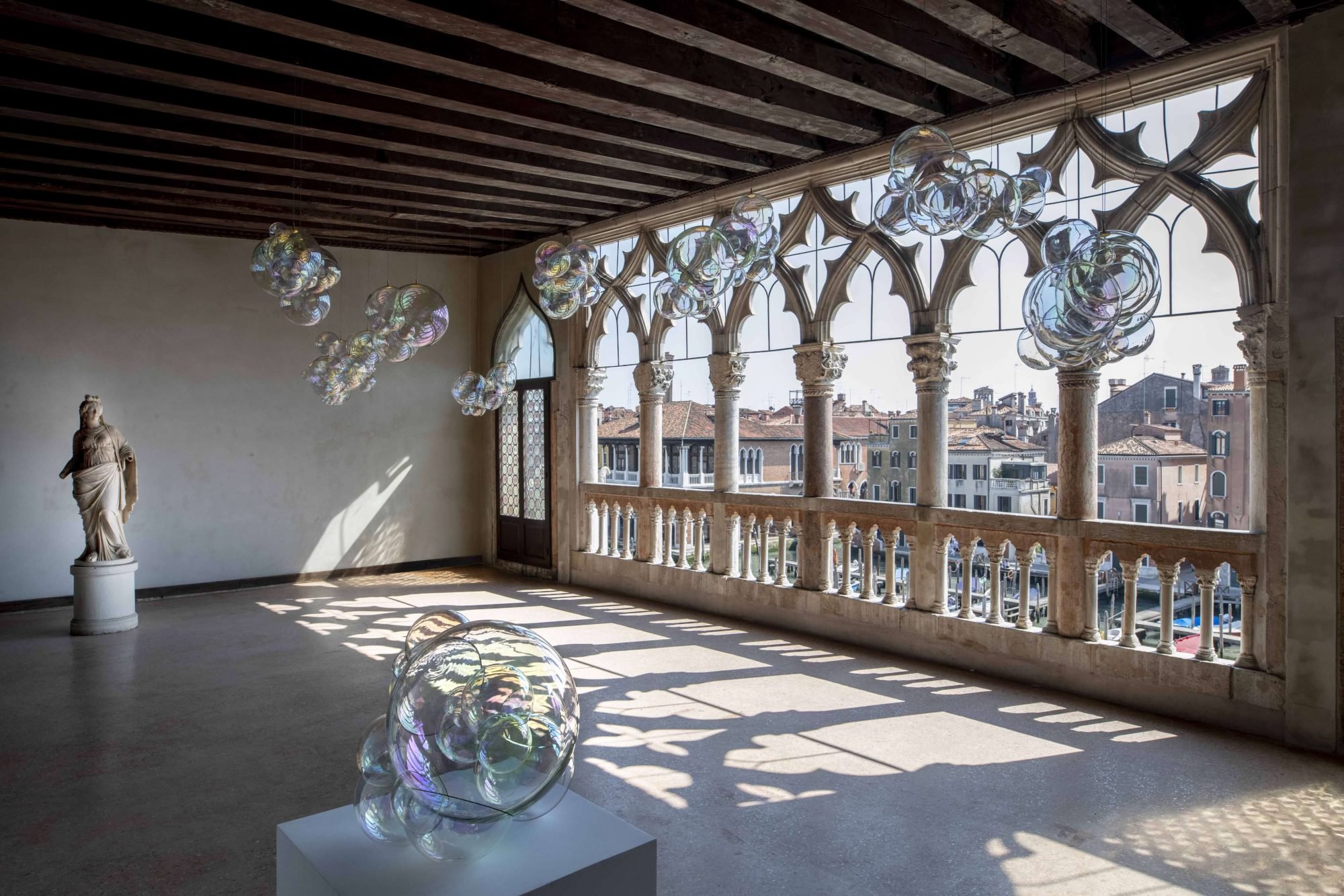 In the monumental 15th century courtyard of Ca’ d’Oro, visitors can walk through a forest of light by Nacho Carbonell. The golden shimmering texture of his tree-like, organic sculptures reference the gilt and polychrome decorations. Similarly, the patina of Ingrid Donat’s Klimt Cabinet (2017) refers to the palazzo’s former golden decorations, while its openwork facade was inspired by the patterns of Venetian stained-glass windows and Burano lace. The Verhoeven Twins will transform, with Piaget, the First Floor Lodge with Moments of Happiness (2019), a mystical constellation of feather-light and supple impressions of bubbles, whose iridescent surfaces reflect and refract light.