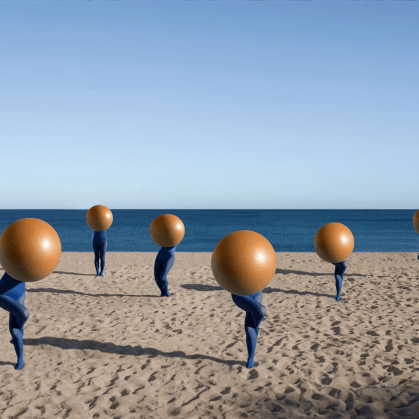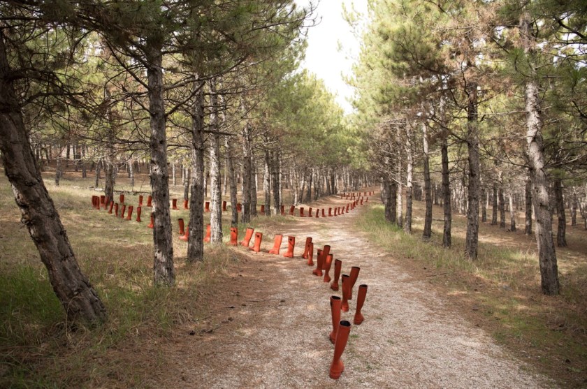 To do this, she has photographed a series of things (rubber boots, balls, sheets or shirts) temporarily staged in different contexts and natural landscapes and arranged imitating curved patterns, sticking to or in contrast with what surrounds them.