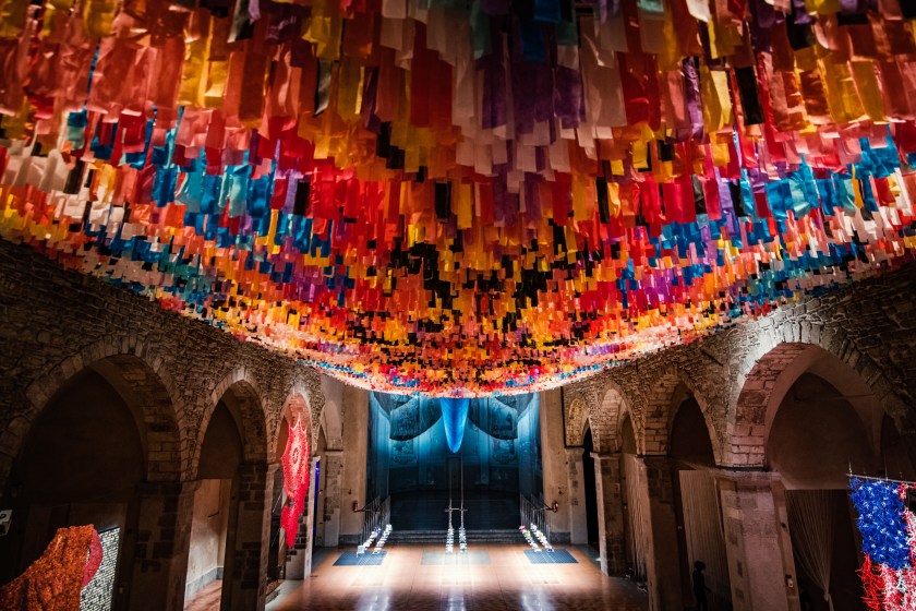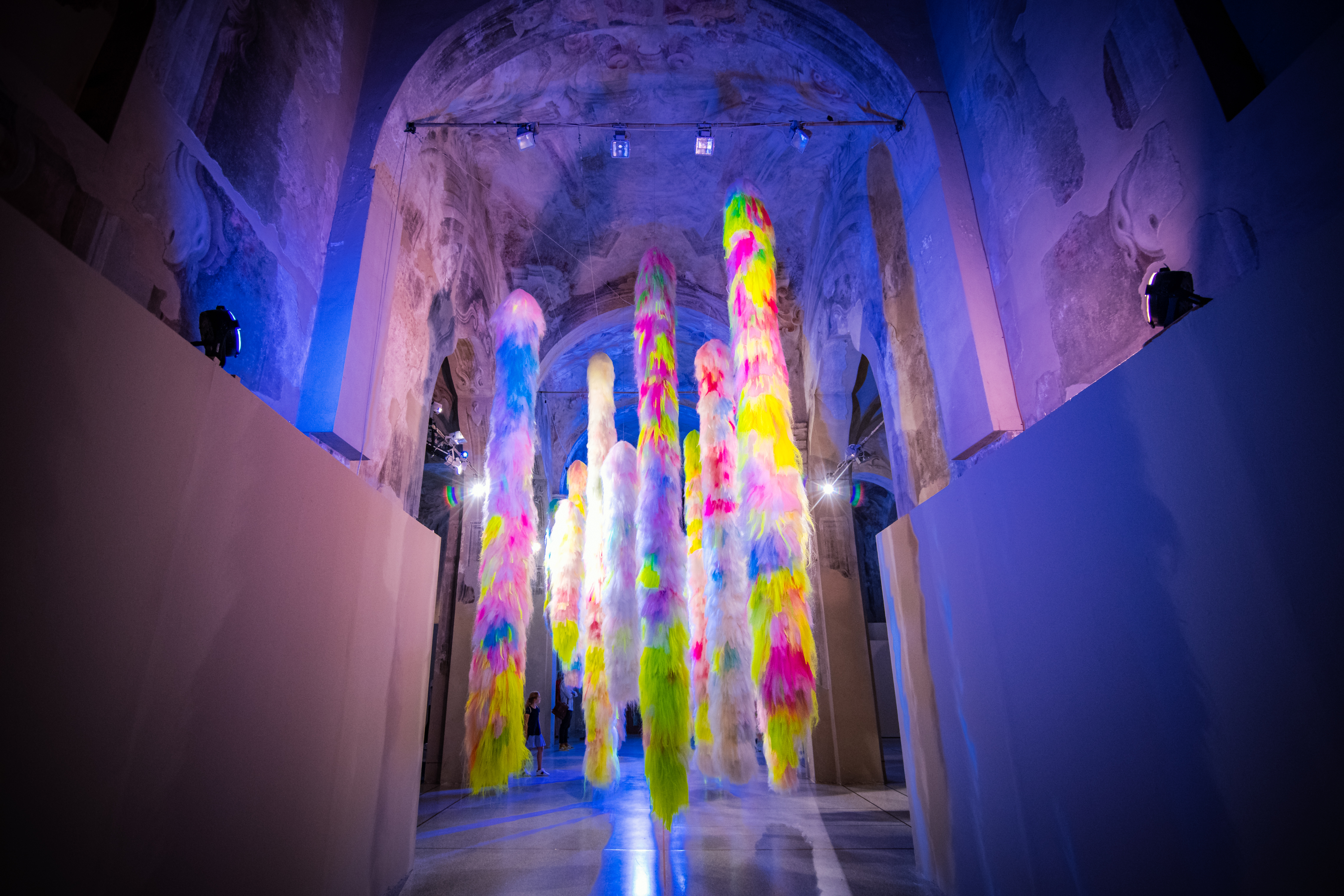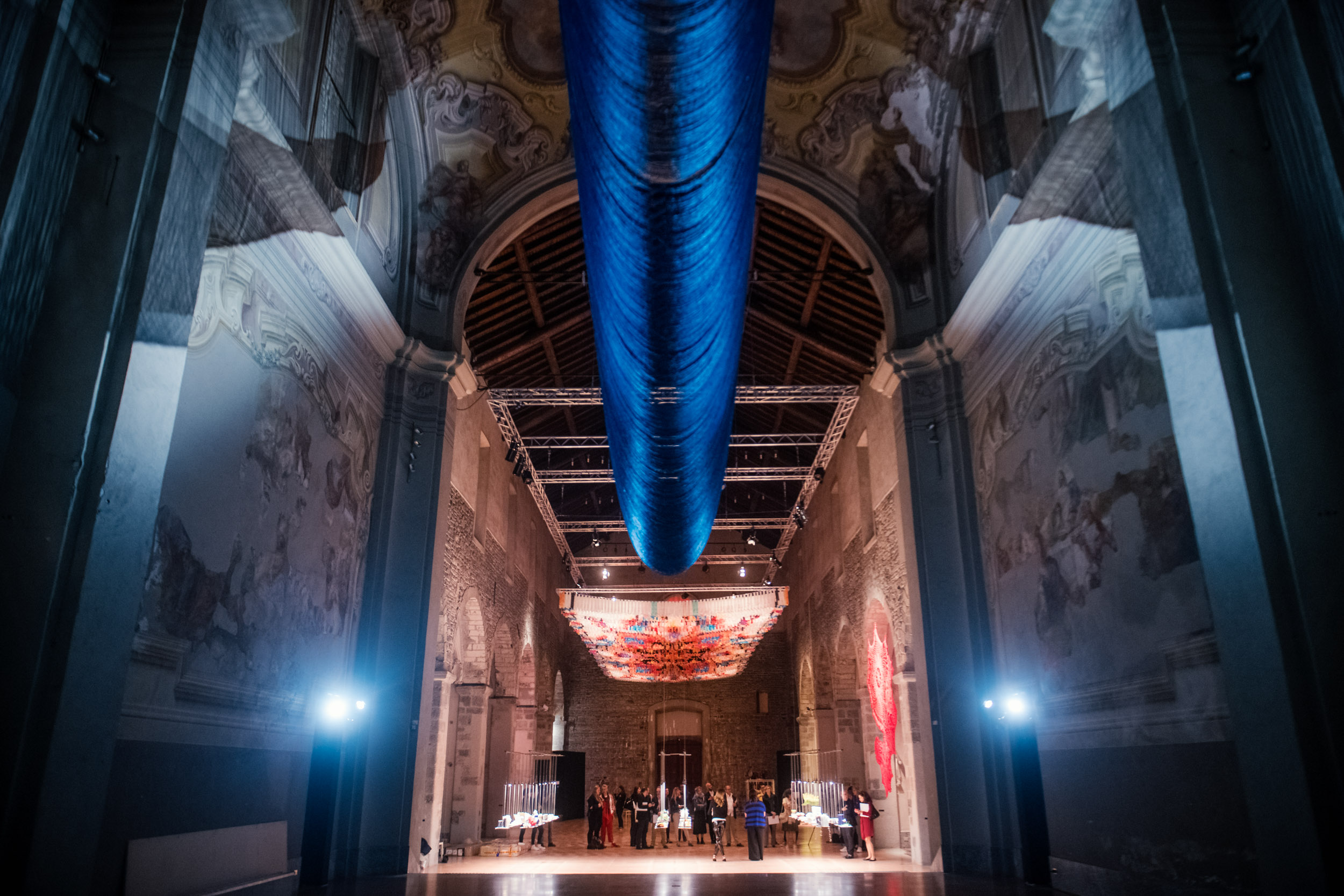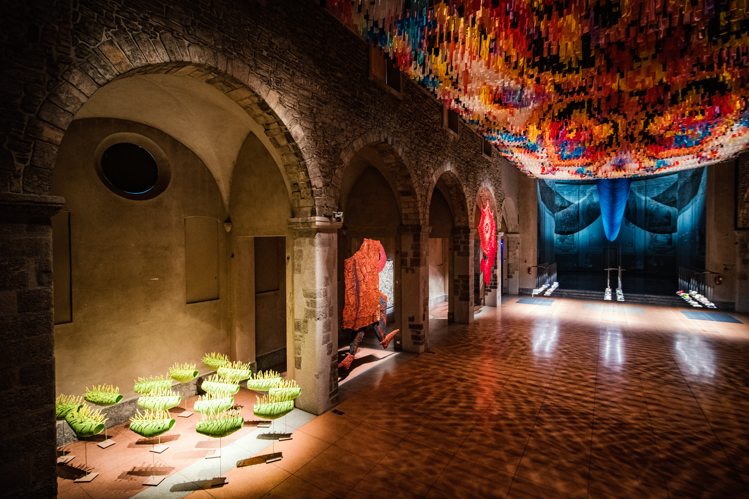 The eye here is immediately struck by the uninterrupted macro-installation, suspended all the way along the great nave of San Francesco’s church, leading to the supposition that perhaps all thirteen selected artists at the historic exhibition are coordinated. The other pop-up, colorful and palyful, emerging through the waving with illusory reassuring hints. It allows itself to permeated by the 54 minitextiles work of the annual selection. They seem to be floating at the heart of the installation. They evoke the timeless wonder of animated children’s books with carved shapes that burst into three dimensions, never ceasing to amaze, like conjuring tricks. These are a constantly revitalized invention, spanning eight hundred years, without aging as does the interactive graphic material on the web, with its rapid obsolescence, where all is gone and forgotten after just a few years of life.