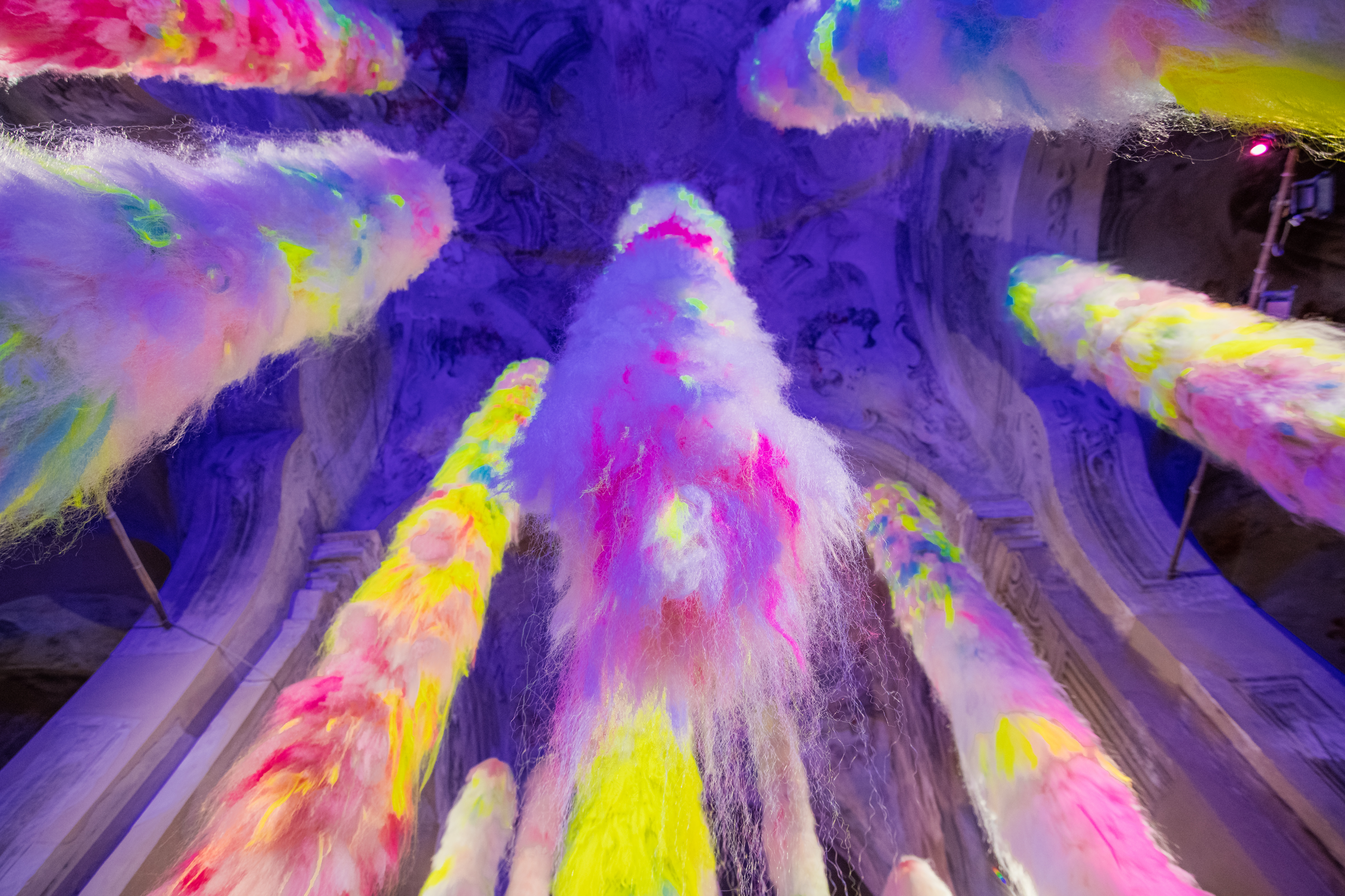 // Le stalattiti di fibra sintetica colorata di Shoplifter, realizzate con i capelli più comunemente impiegati nella creazione delle parrucche, abbracciano e catturano. Invitano a MINIARTEXTIL 2019, dove tutto appare e si apre, proprio come nei libri POP UP.