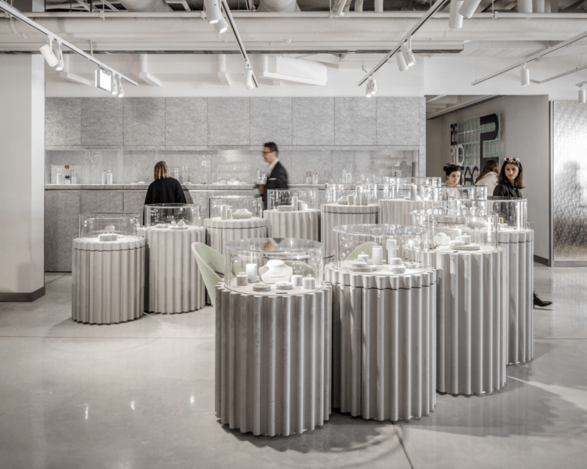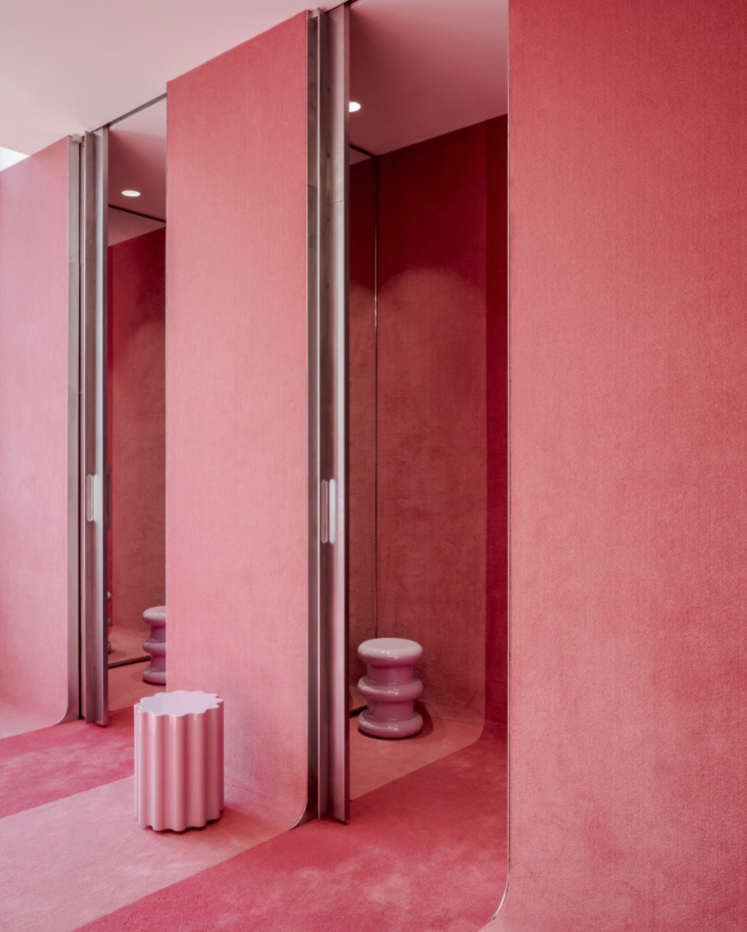 A grand staircase, which doubles as an auditorium during events, takes visitors to the mixed-use space on the first floor which features creative and emerging brands, as well as a denim lab, jewelry display, limited edition sneakers and tech products.