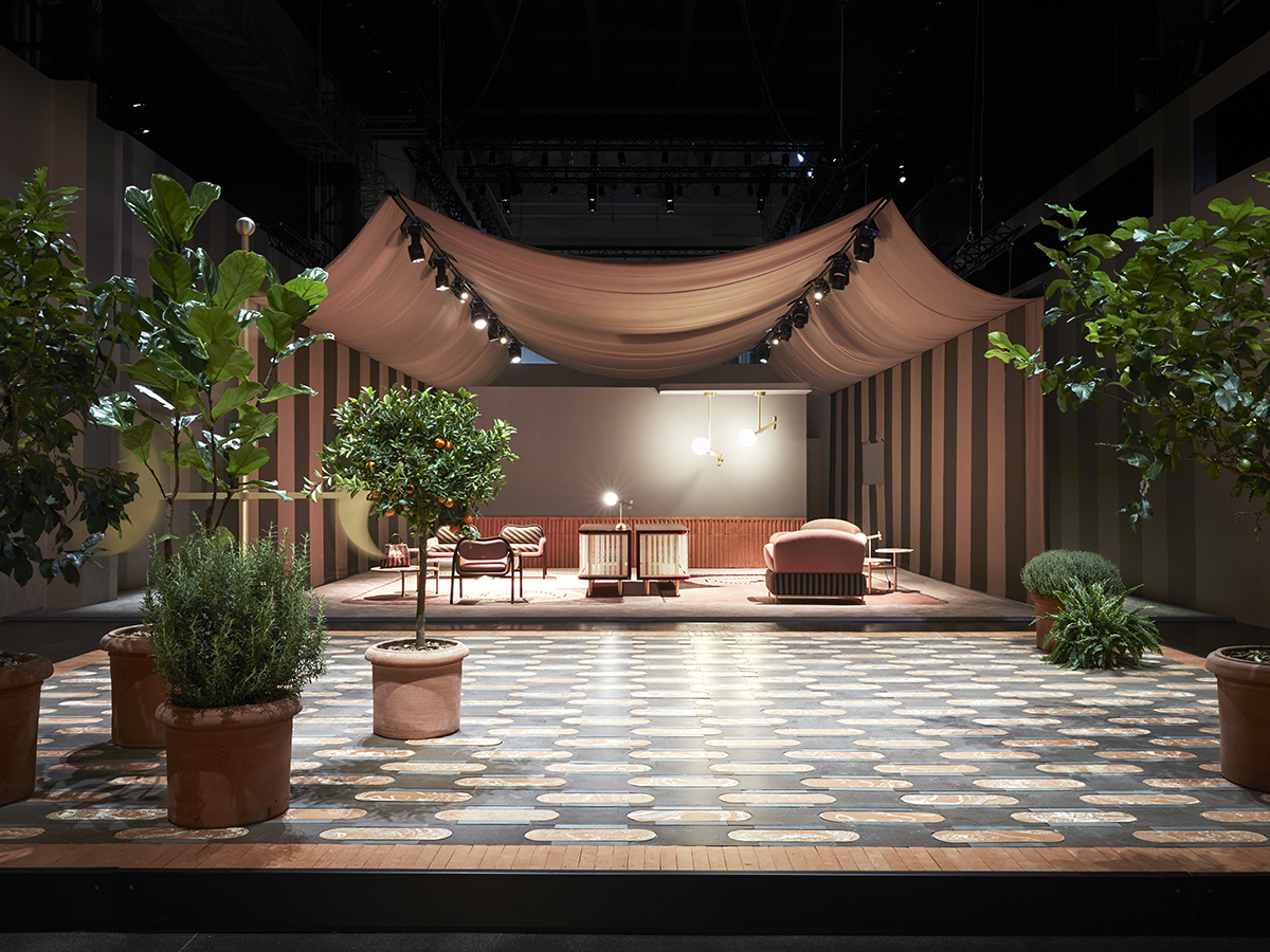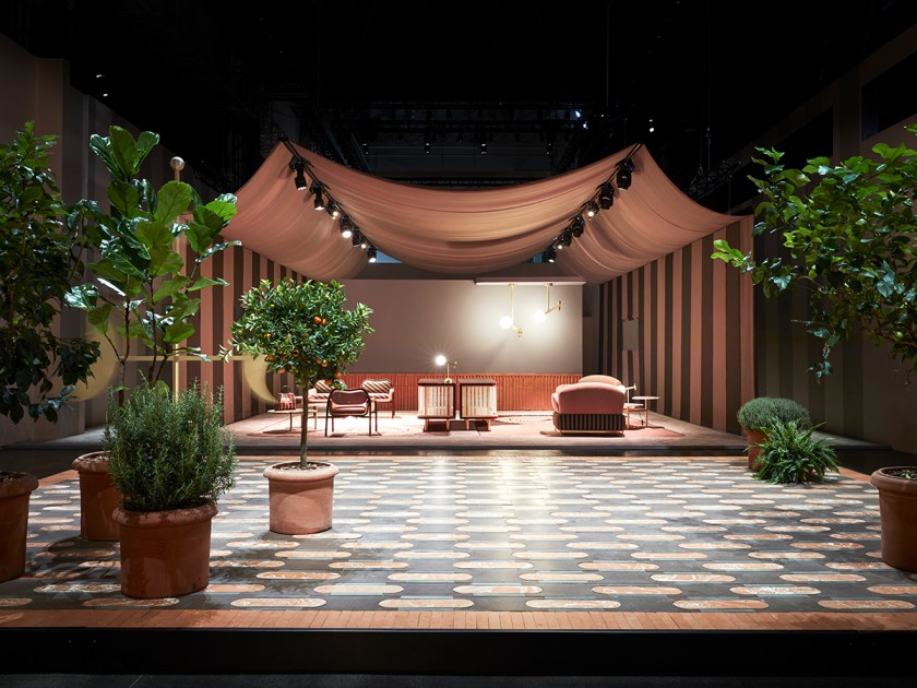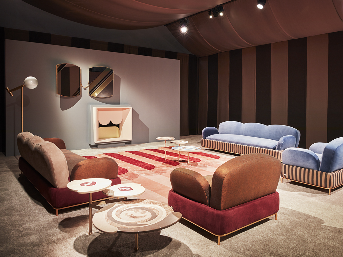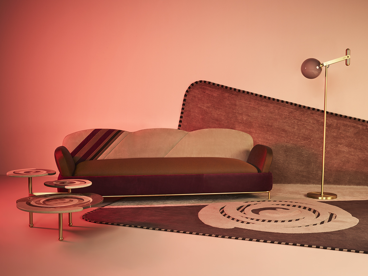 Divani e poltrone dalle forme sinuose indossano perfettamente le righe Pequin, abbinando così forme femminili a look geometrici più maschili. Insieme al motivo a righe, la designer ha selezionato dagli archivi Fendi anche il disegno a forma di rosa, ideato da Karl Lagerfeld nel 1987, utilizzandolo per tavolini e tappeti, dove il logo FF emerge con grazia.