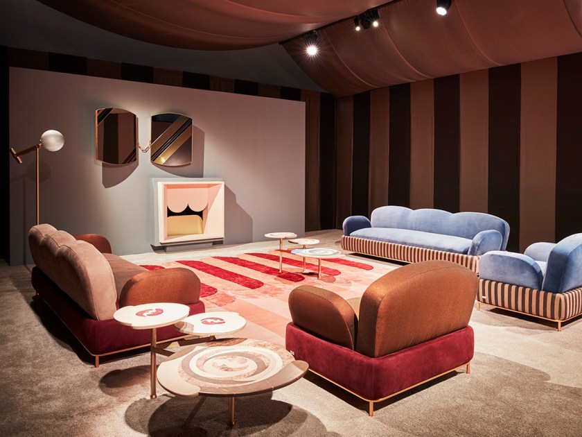 Sinuous armchairs and sofas wears perfectly the Pequin stripes, mixing feminine shapes with a mannish geometric look. Together with the stripes the italian designer, who had access to FENDI archives, chose the rose like design (created by Karl Lagerfeld in 1983) and used it for the coffee tables and the carpets, where she let the FF logo emerge gracefully.